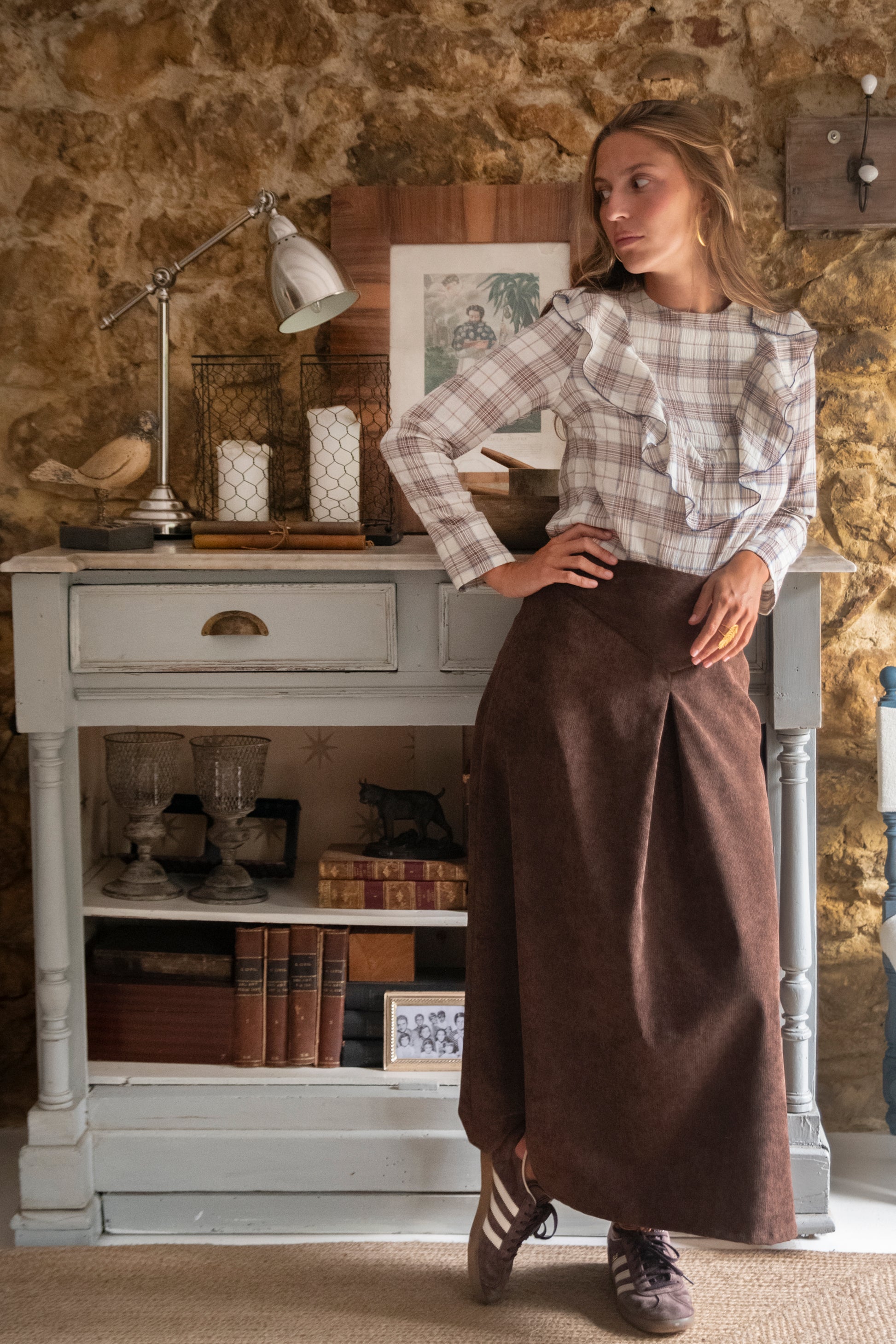 Camisa recta con el cuello a la caja y con un gran volante en pico rematado con repulgo azul. Las mangas son rectas con el puño rematado con un bies. La camisa tiene dos pinzas en el pecho y la espalda es recta con una abertura donde se abrocha con un botón. El bajo es recto con dos aberturas laterales.