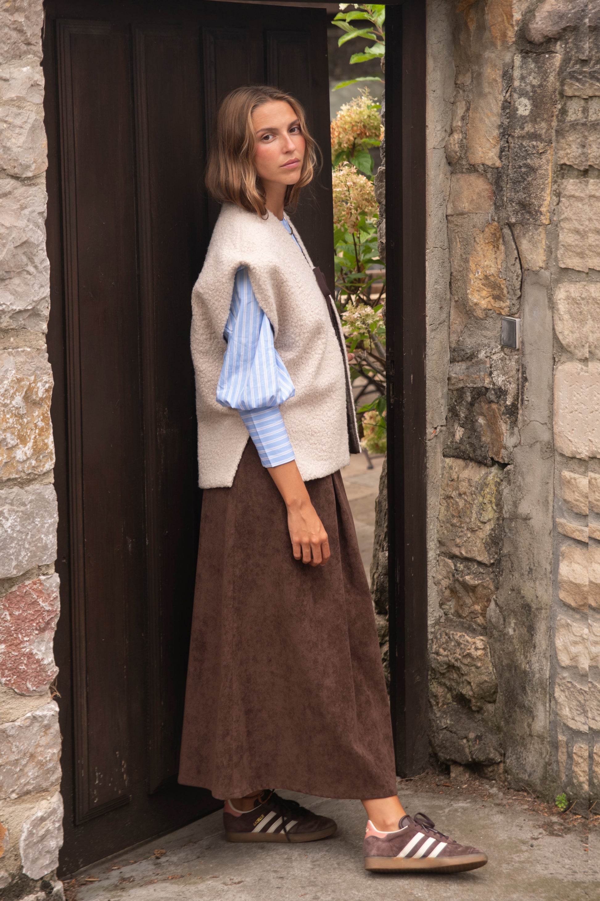 Falda midi acampanada con una cinturilla muy ancha en forma de pico por delante y recta por detrás. La falda tiene un pliegue central dando así, más movimiento. Por detrás se cierra con una cremallera. El tejido es una pana técnica marrón.