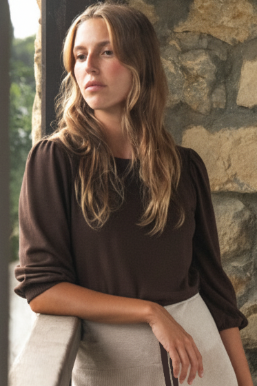 Jersey recto con cuello de barco. Tiene las mangas fruncidas en el hombro y se rematan con un elástico de 2 cm. Está realizado en un punto marrón oscuro liso.
