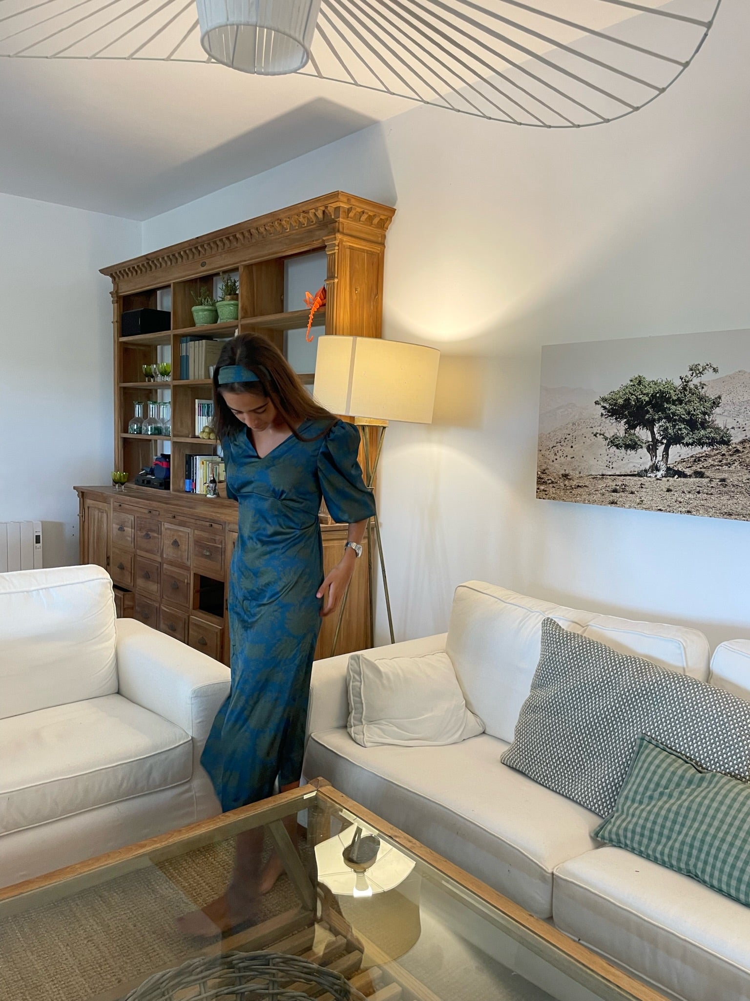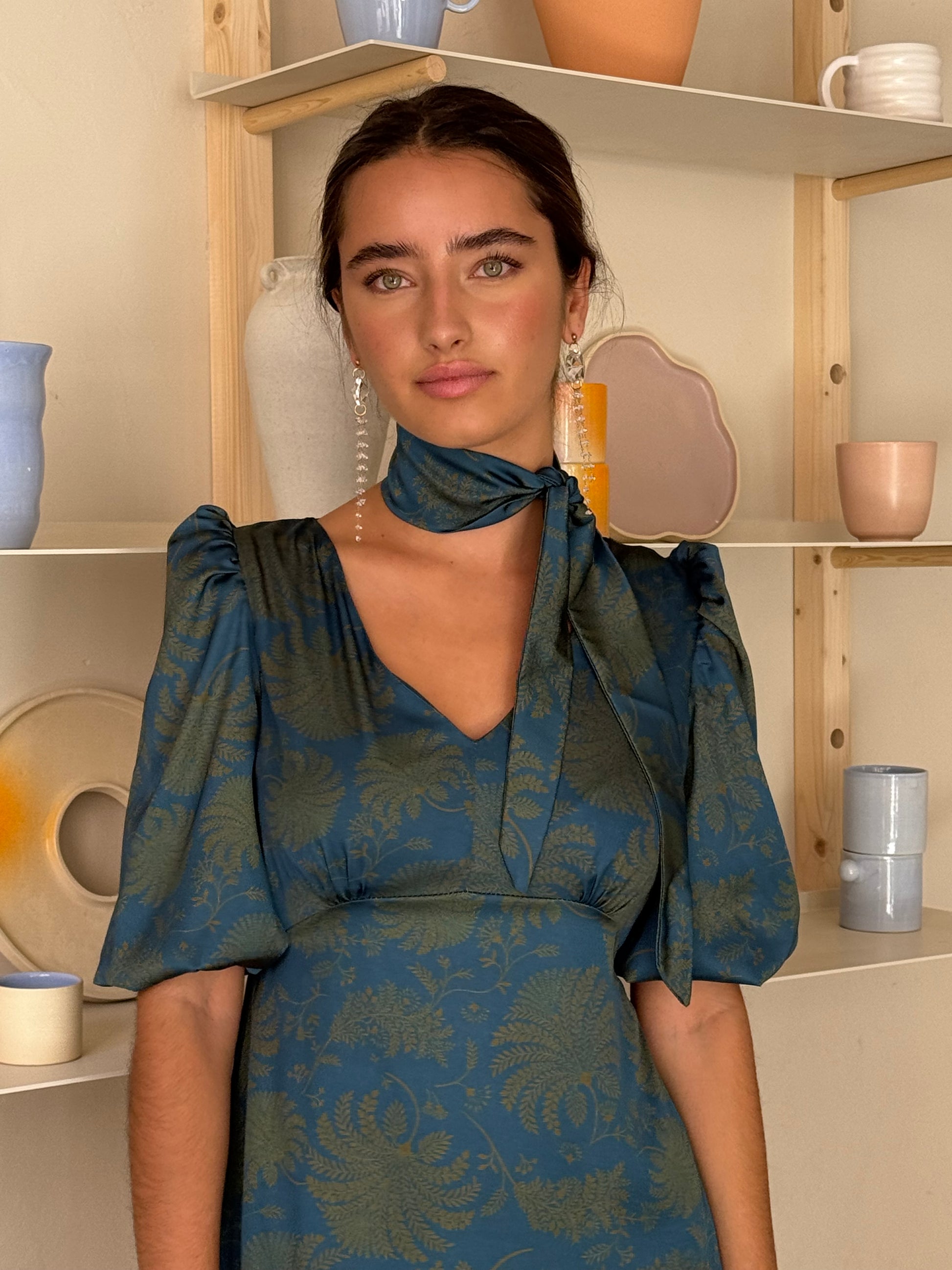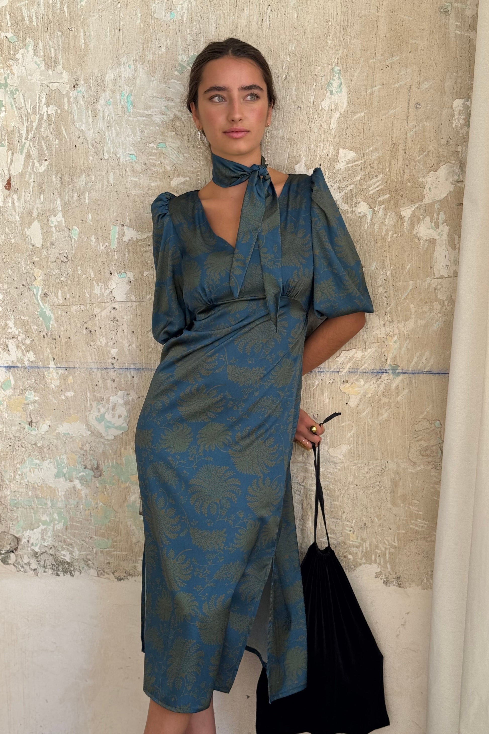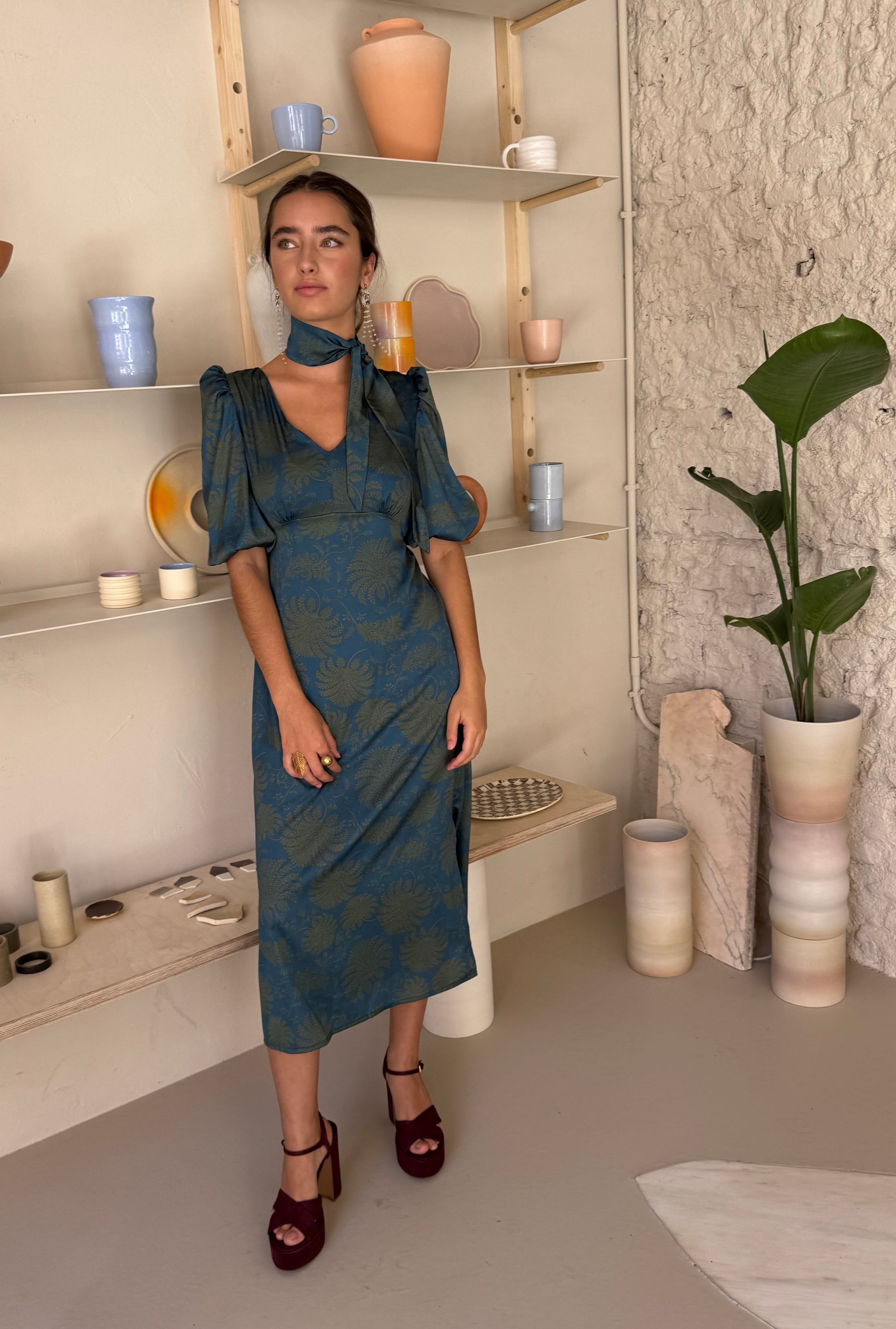 Vestido midi de escote pico. Tiene el corte curvado por encima de la cintura del que salen unos pequeños frunces a cada lado, sustituyendo a las pinzas del pecho. Destacan sus mangas muy abullonadas y forradas dando así más volumen. Se abrocha a la espalda con un botón dejando una pequeña abertura hasta la mitad de la misma y un poco más abajo el vestido se ajusta con un fino elástico. El bajo es recto ya cada lado se abren dos aberturas. Está confeccionado en un fluido estampado con ramas verdes con mucho movimiento. El vestido va forrado hasta la altura de las dos aberturas laterales.