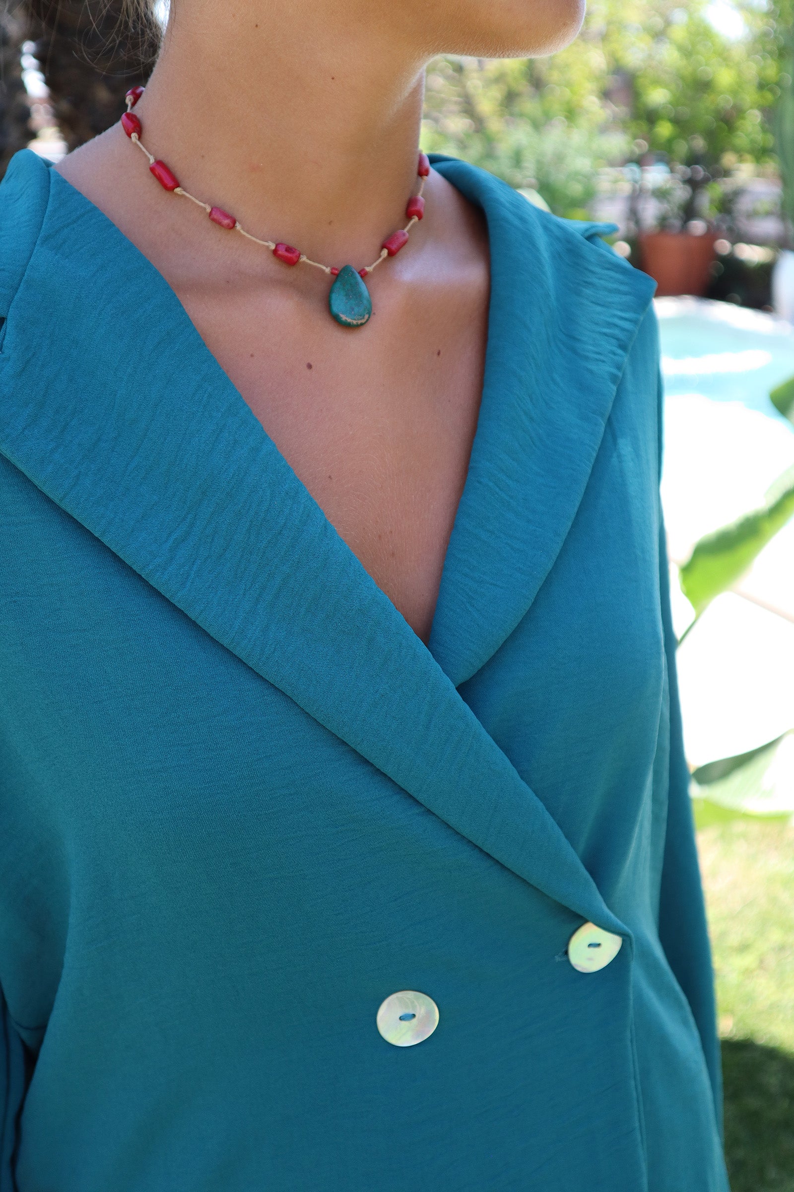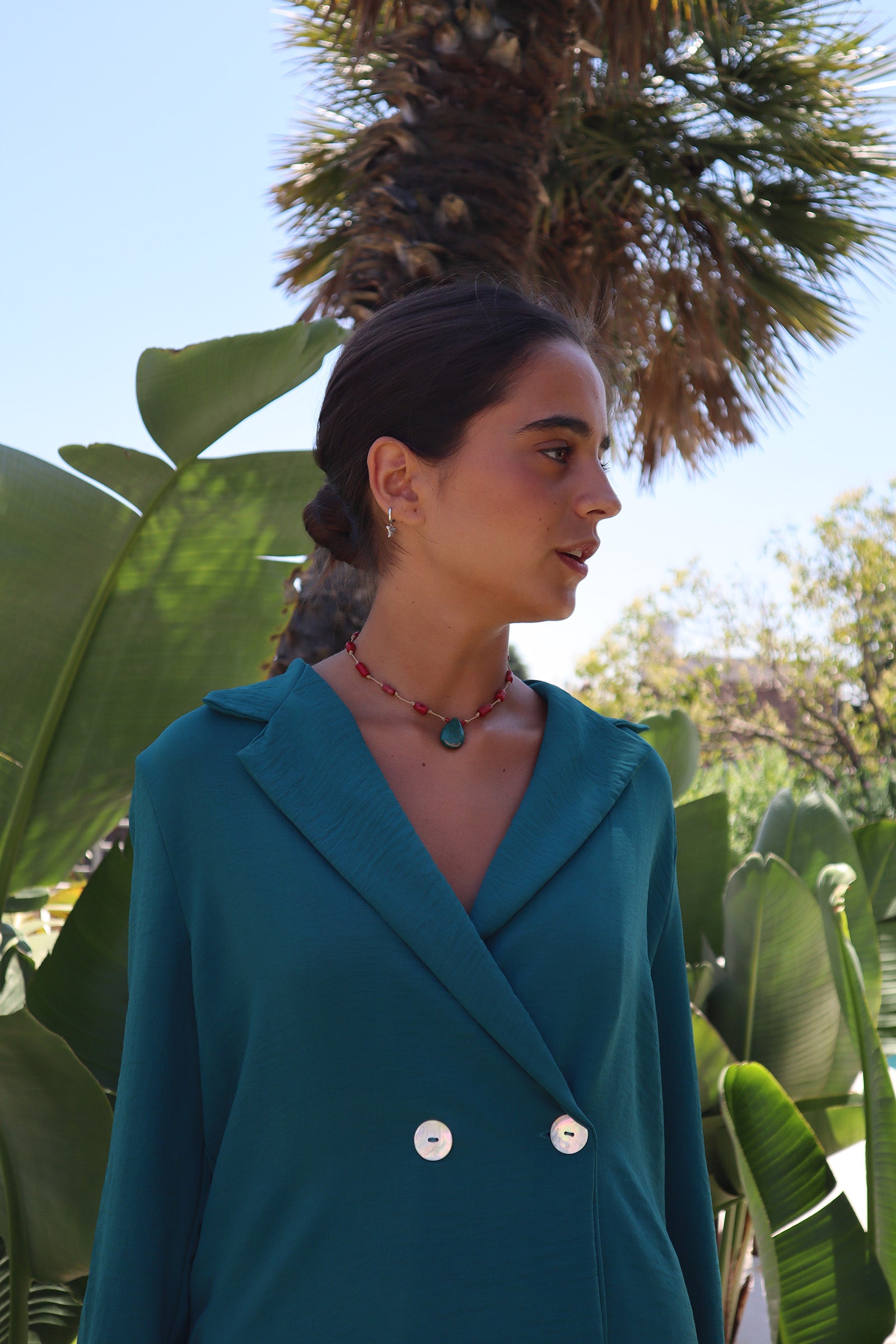 Blazer cruzada sin hombreras que se abrocha con 2 botones de nácar y otro interior. La espalda es recta, sin canesú. Tiene dos aberturas laterales y no está forrada.