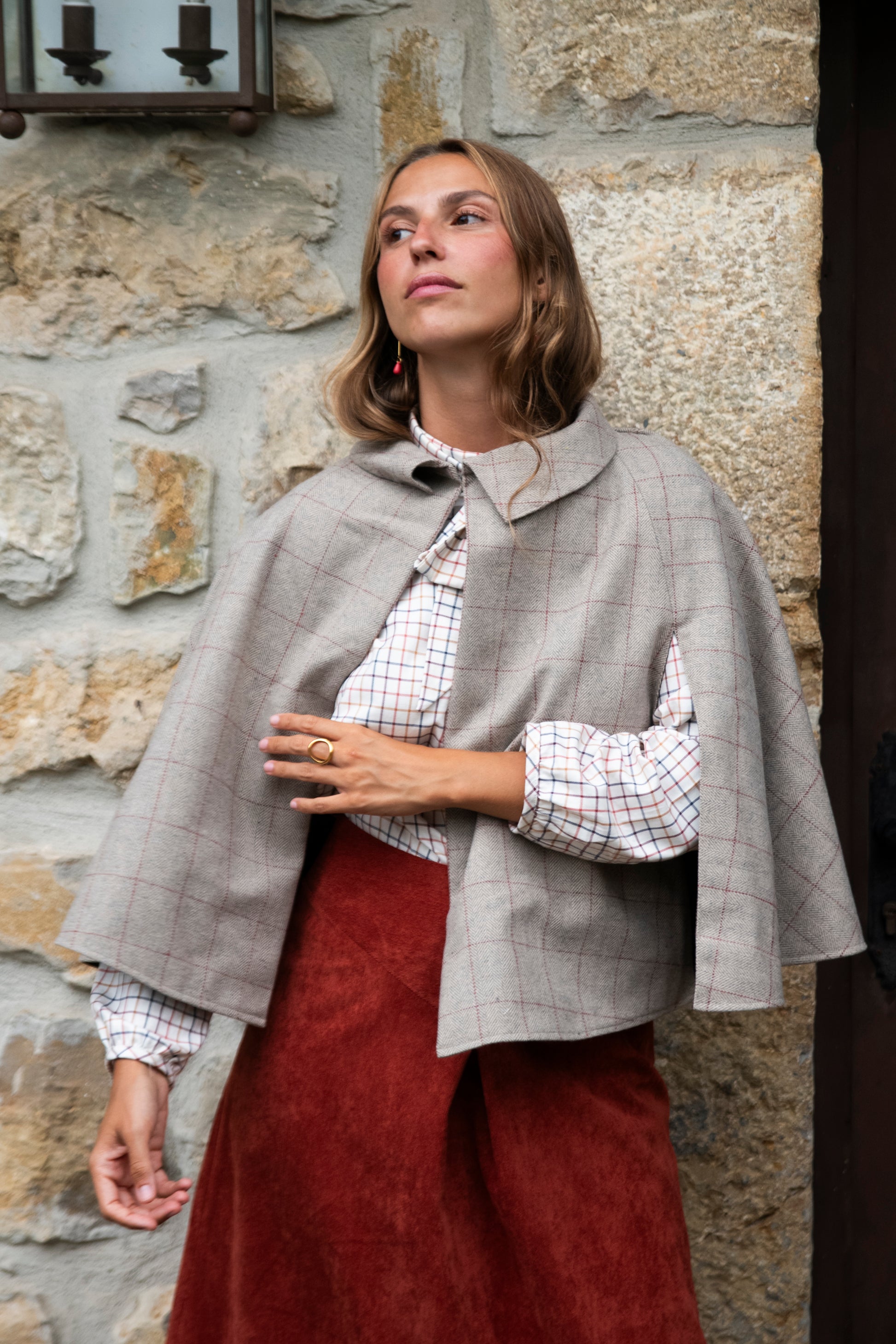 Capa corta con cuellos de pico, abrochada con un único botón de coco. Tiene dos grandes aberturas en los laterales para sacar los brazos. Está realizada en un tejido de lana con una cuadrícula fina teja sobre una espiguilla beige. La capa tiene un forro granate de milrayas. Es una prenda con mucho estilo, que te hará destacar con diferentes looks.