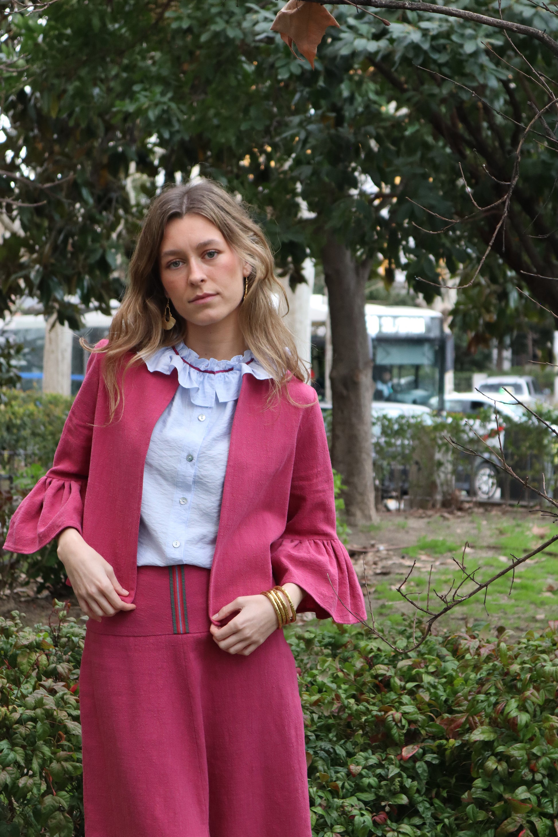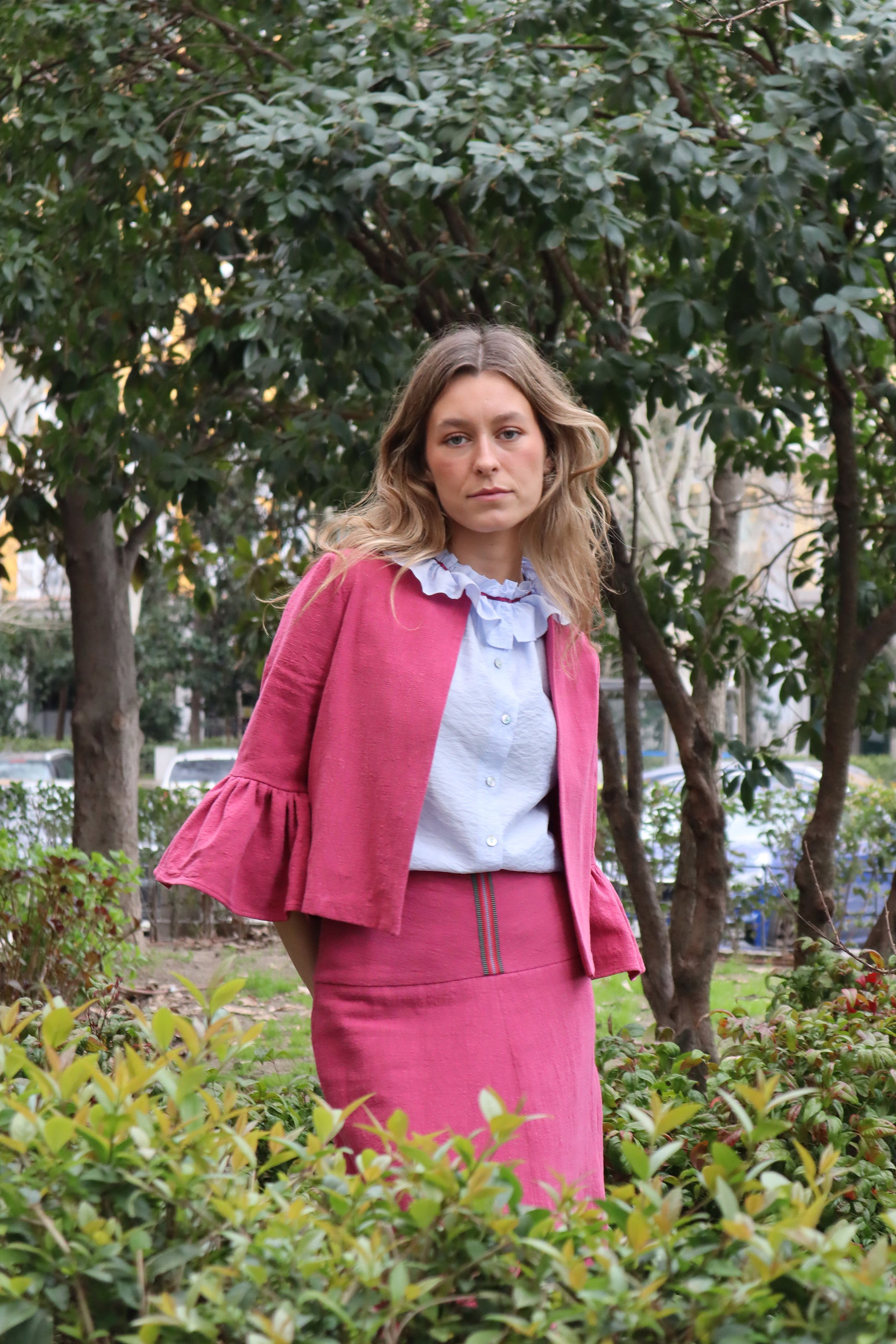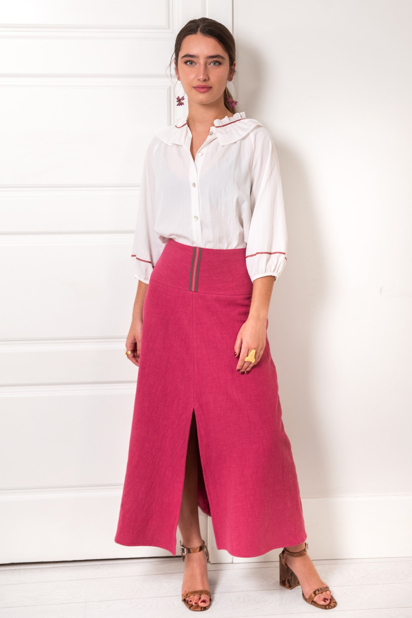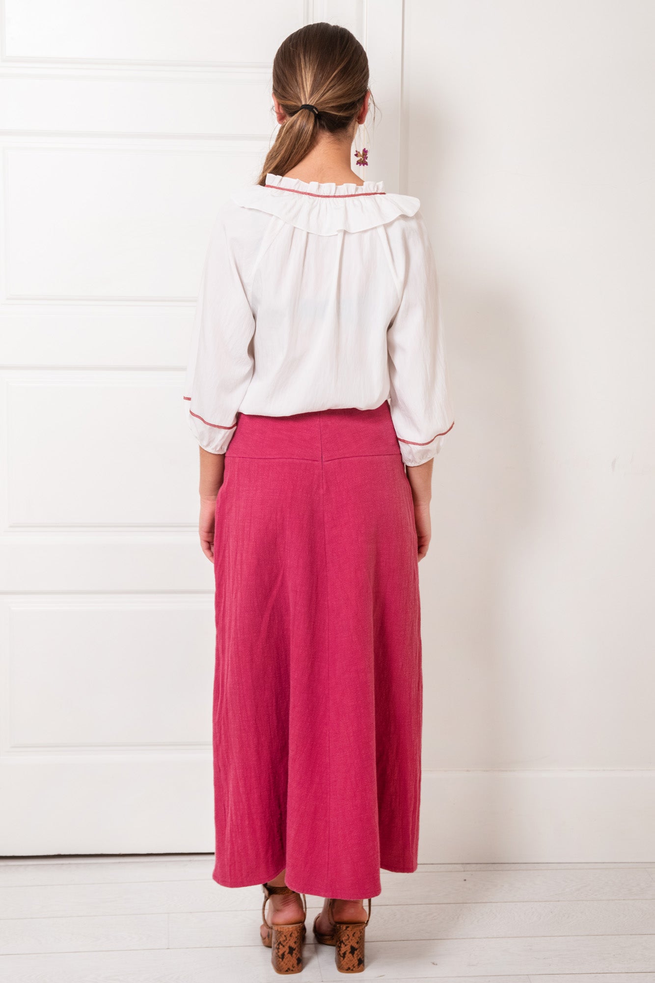 Falda midi acampanada con una cinturilla muy ancha (12 cm) que abrocha detrás con cremallera. Resalta el adorno de la cinta en tonos fucsias y verde. La forma acampanada se acentúa con la abertura central de la parte de delantera. Es una falda concebida para sujetarla en la cadera. Está realizada en ramio, que asemeja un lino rústico, de color fresa, lavado a la piedra.