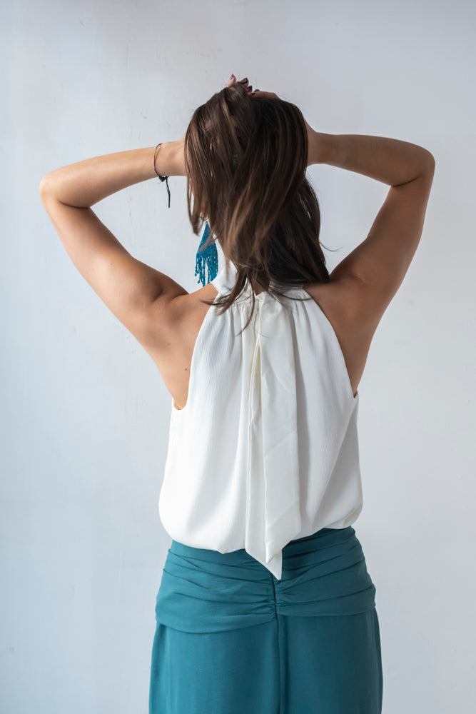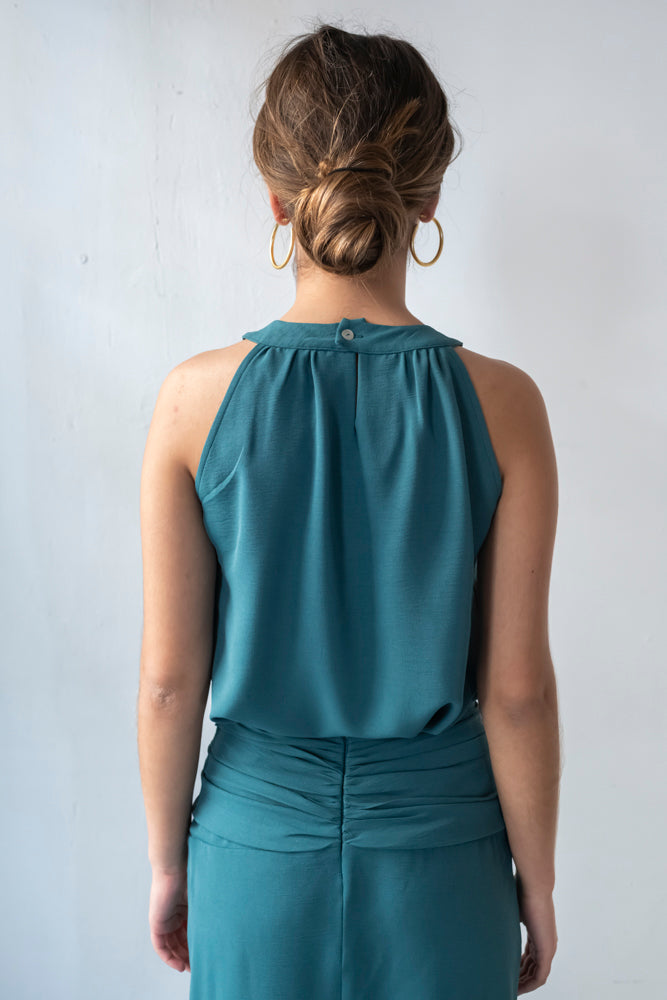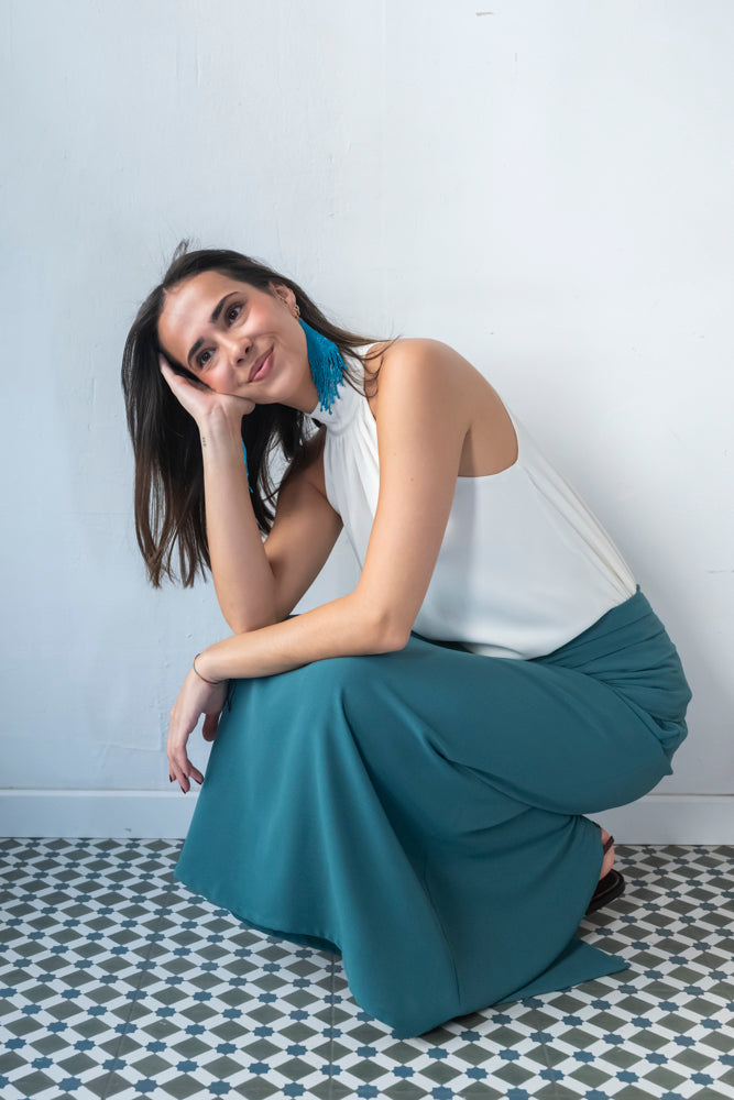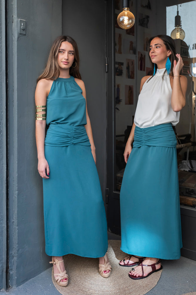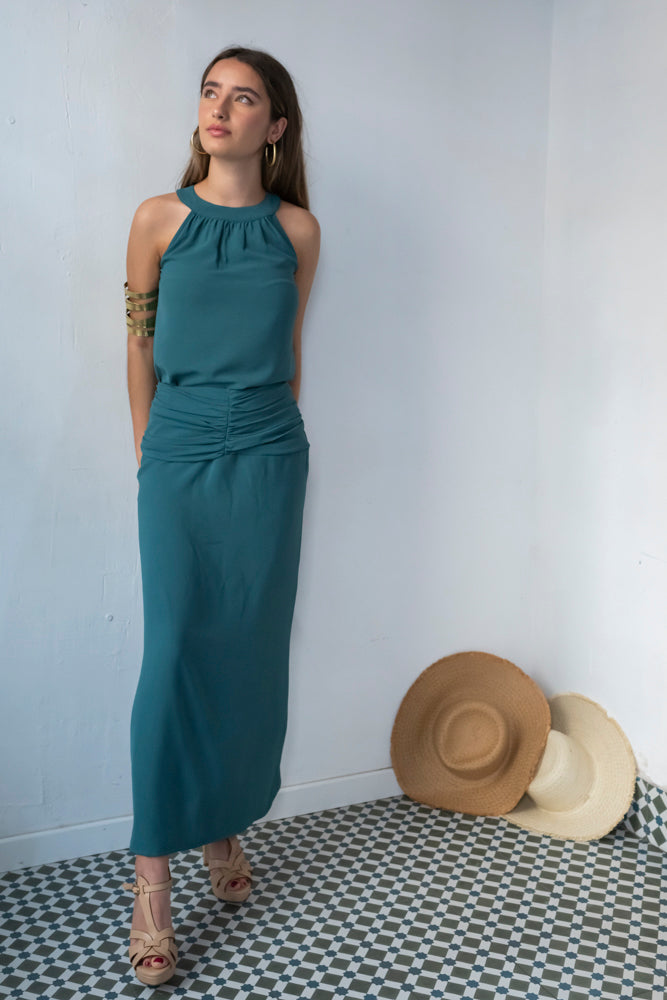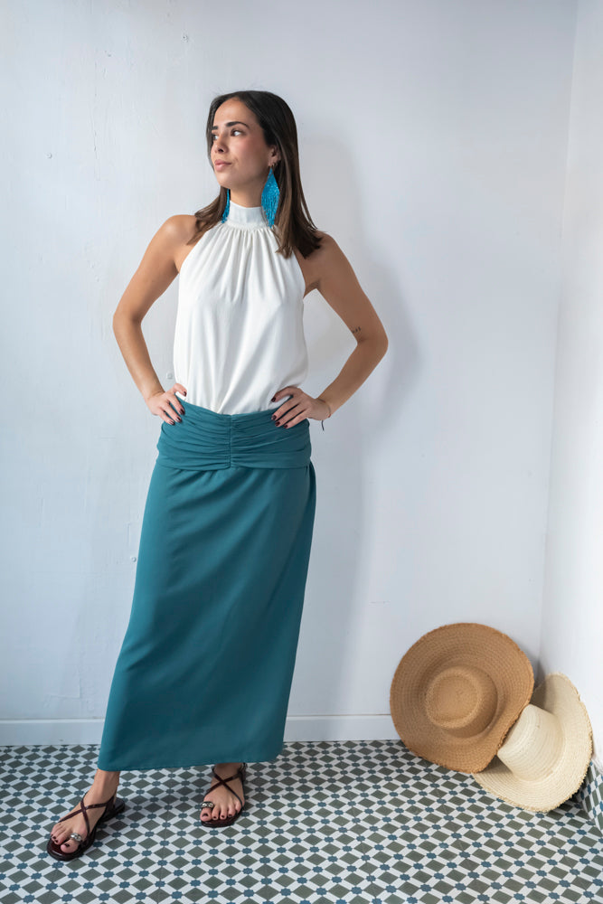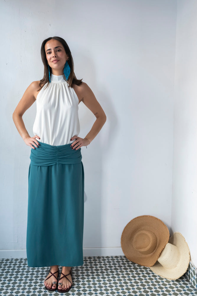 Falda recta midi, con un drapeado de 13 cm en su cintura por delante y por detrás. Tiene una gran abertura en la parte de detrás, donde también se cierra con una cremallera. Está realizada en un fluido de color verde clorofila y sin forro. Este tejido fluido es muy cómodo ya que no se arruga y casi no necesita plancha.