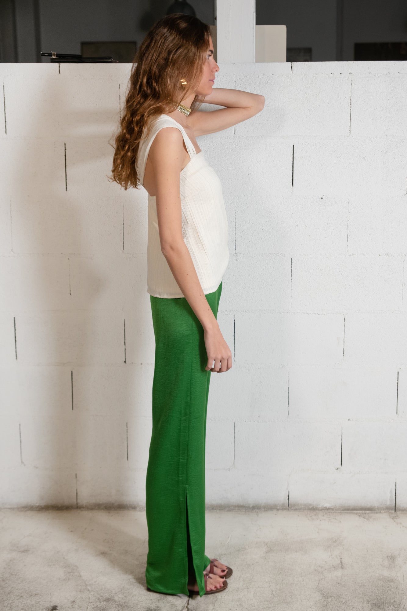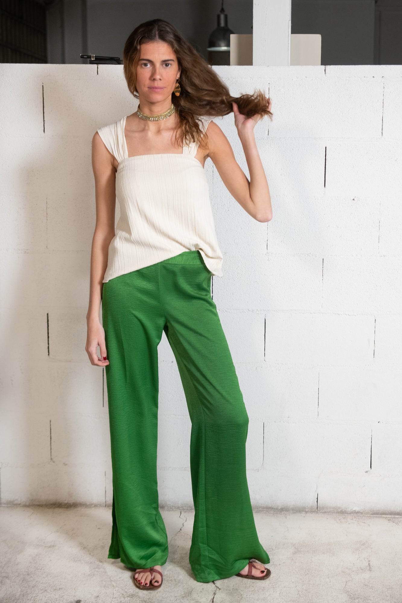 Pantalón palazzo largo con  cintura lisa por delante y elástico por detrás. Con su tejido satinado verde y fluido, se consigue gran caída y movimiento. Este tejido fluido es muy cómodo ya que no se arruga y casi no necesita plancha.