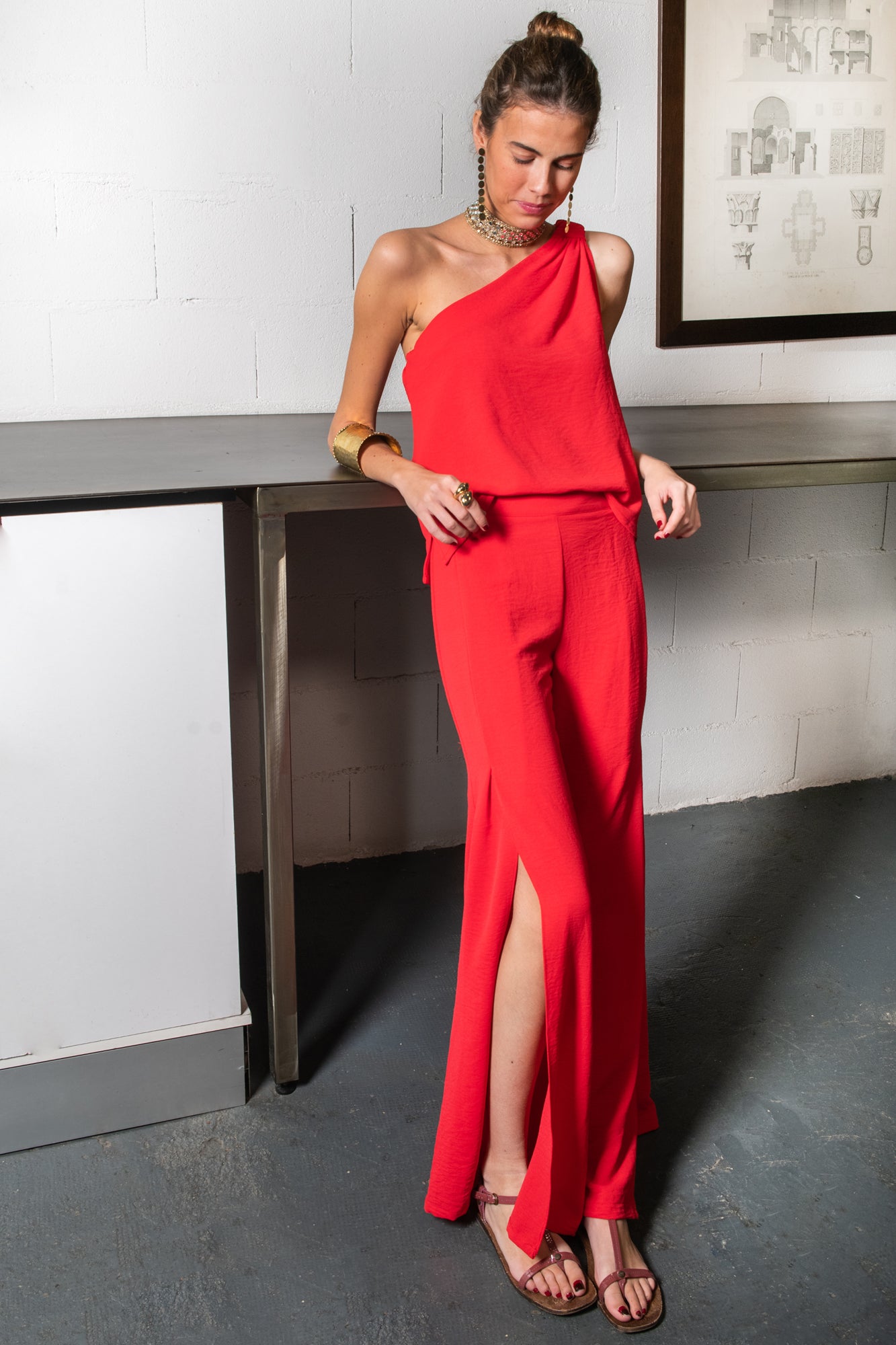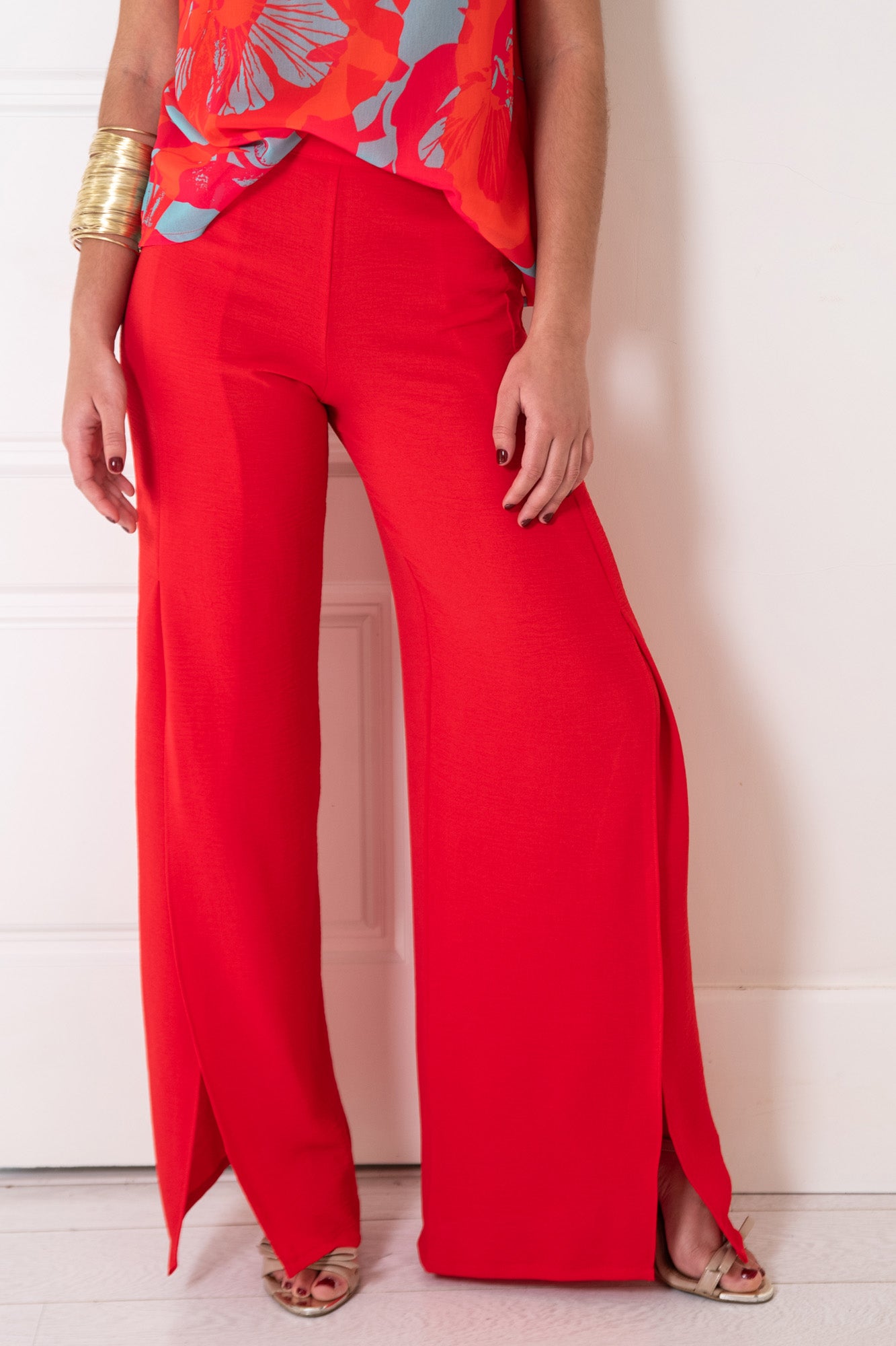 Pantalón palazzo con dos grandes aberturas laterales que nacen encima de la rodilla. Tiene la cinturilla lisa por delante y con elástico por detrás. El tejido es un fluido rojo con gran caída que da mucho movimiento a la prenda y que casi no arruga ni necesita plancha.