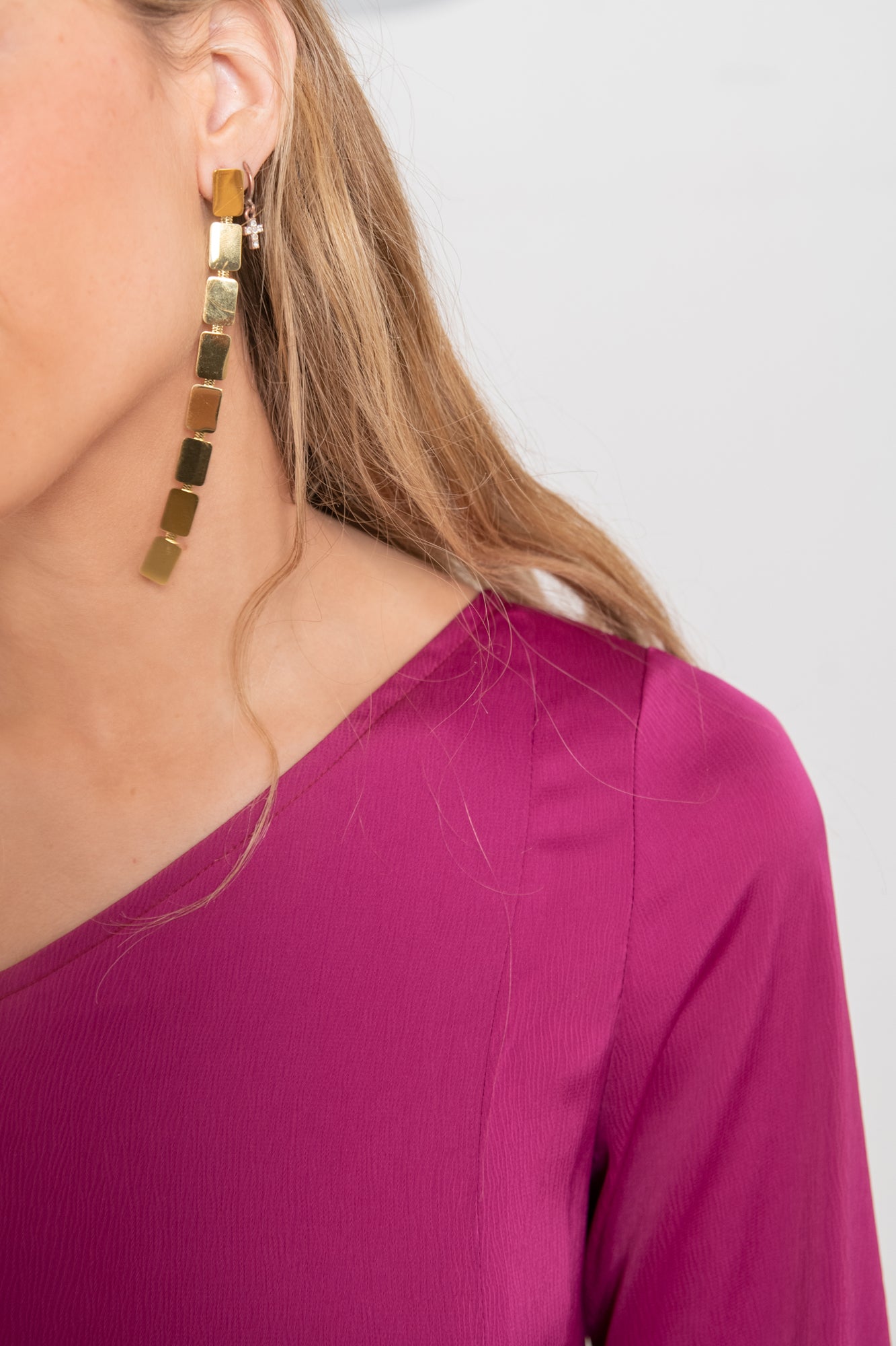 Vestido largo y un poco entallado confeccionado en un satinado con un ligerísimo relieve. Es de corte asimétrico con una sola manga francesa un poco abullonada y termina en un bies de la misma tela. En la parte delantera del vestido hay una costura que empieza desde el hombro y termina por encima de la rodilla acabando en una abertura.