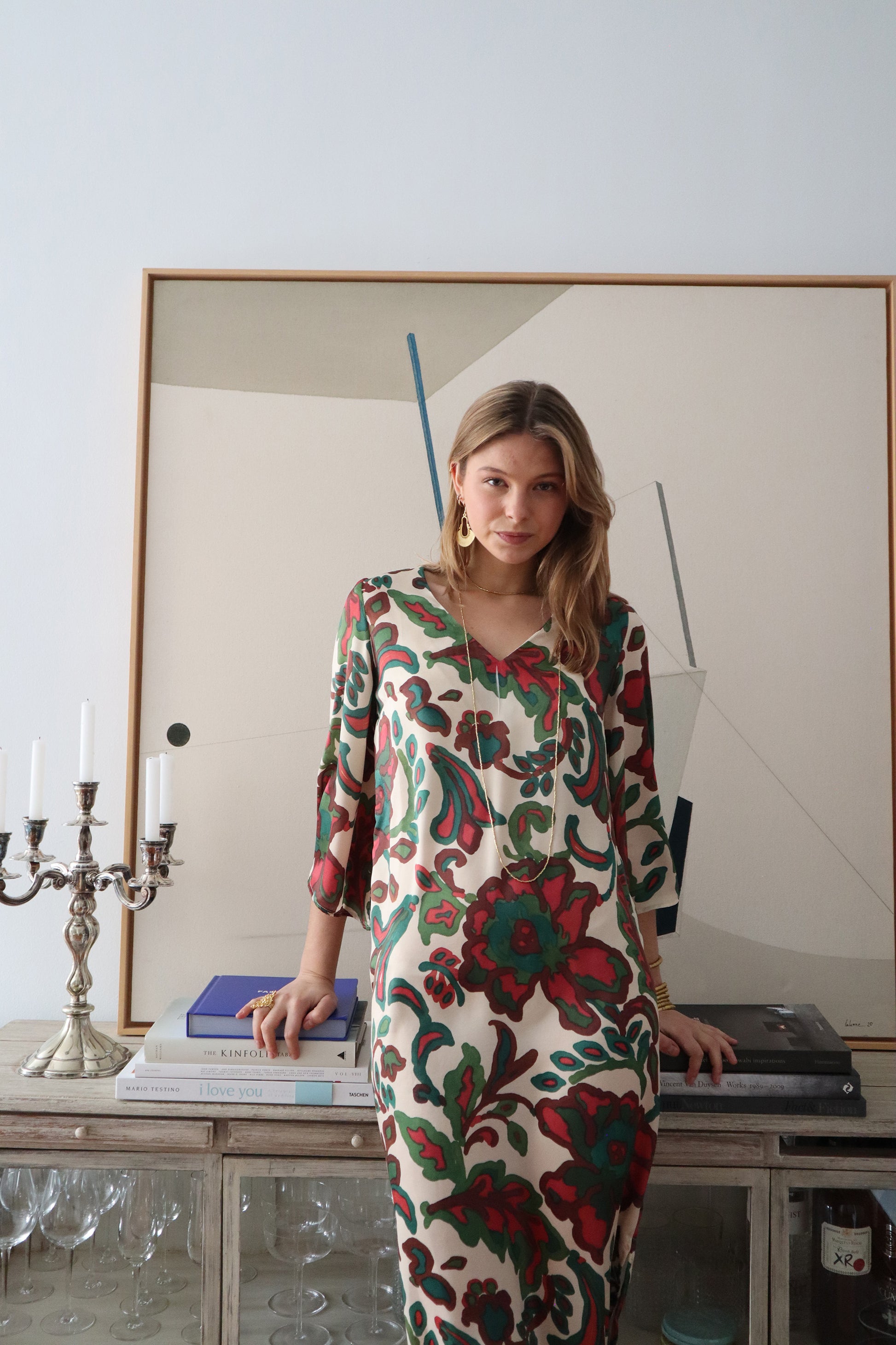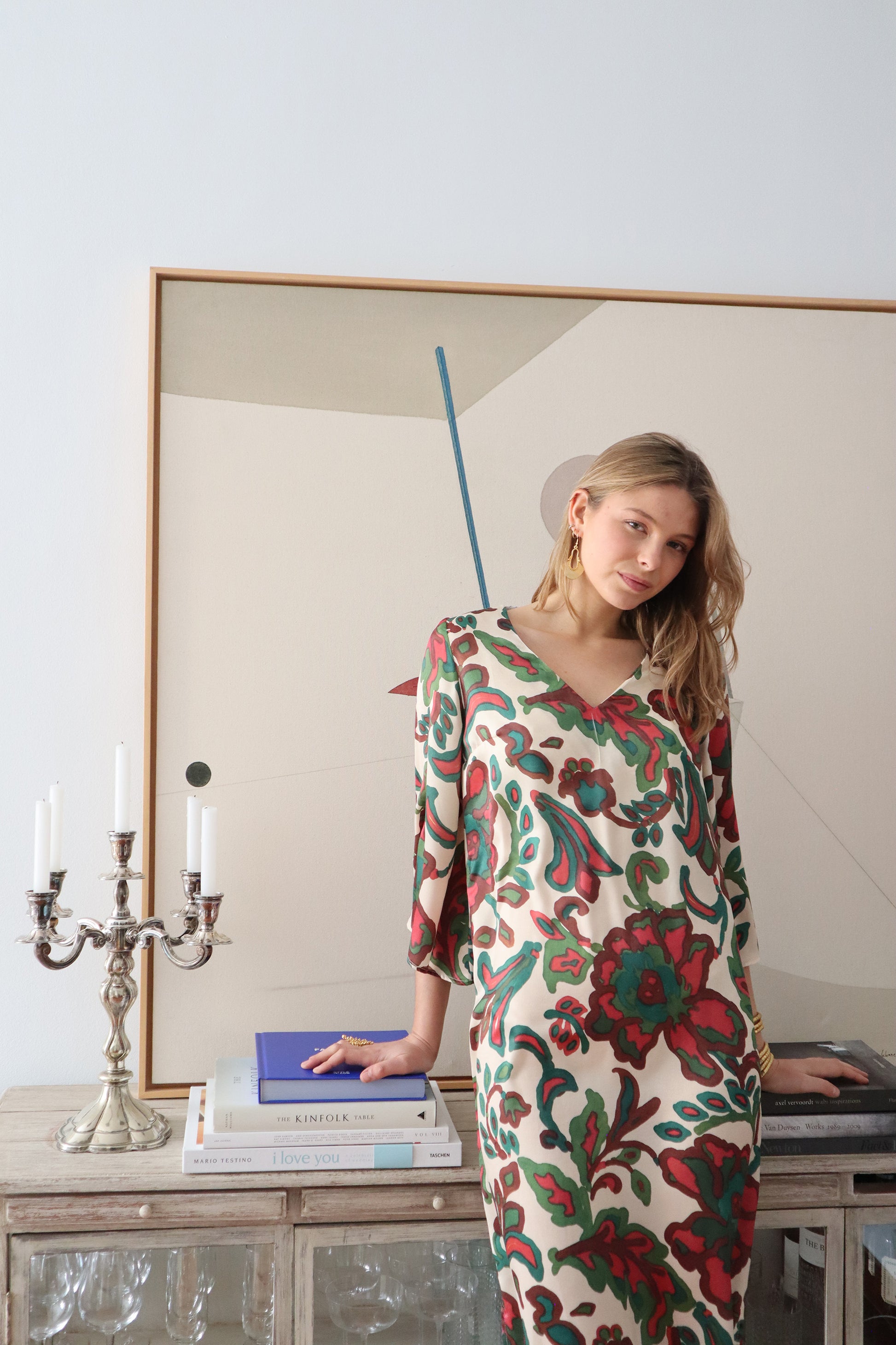 Vestido de corte recto, largo hasta el tobillo y con manga francesa acampanada. Tiene un escote de pico y 2 pinzas delanteras y la espalda es totalmente recta, sin canesú. En los laterales se abren 2 grandes aberturas y el bajo es recto. Está realizado en un satinado de flores verdes y ocres.