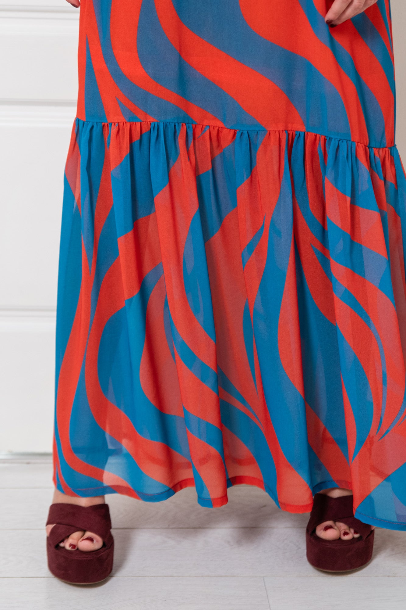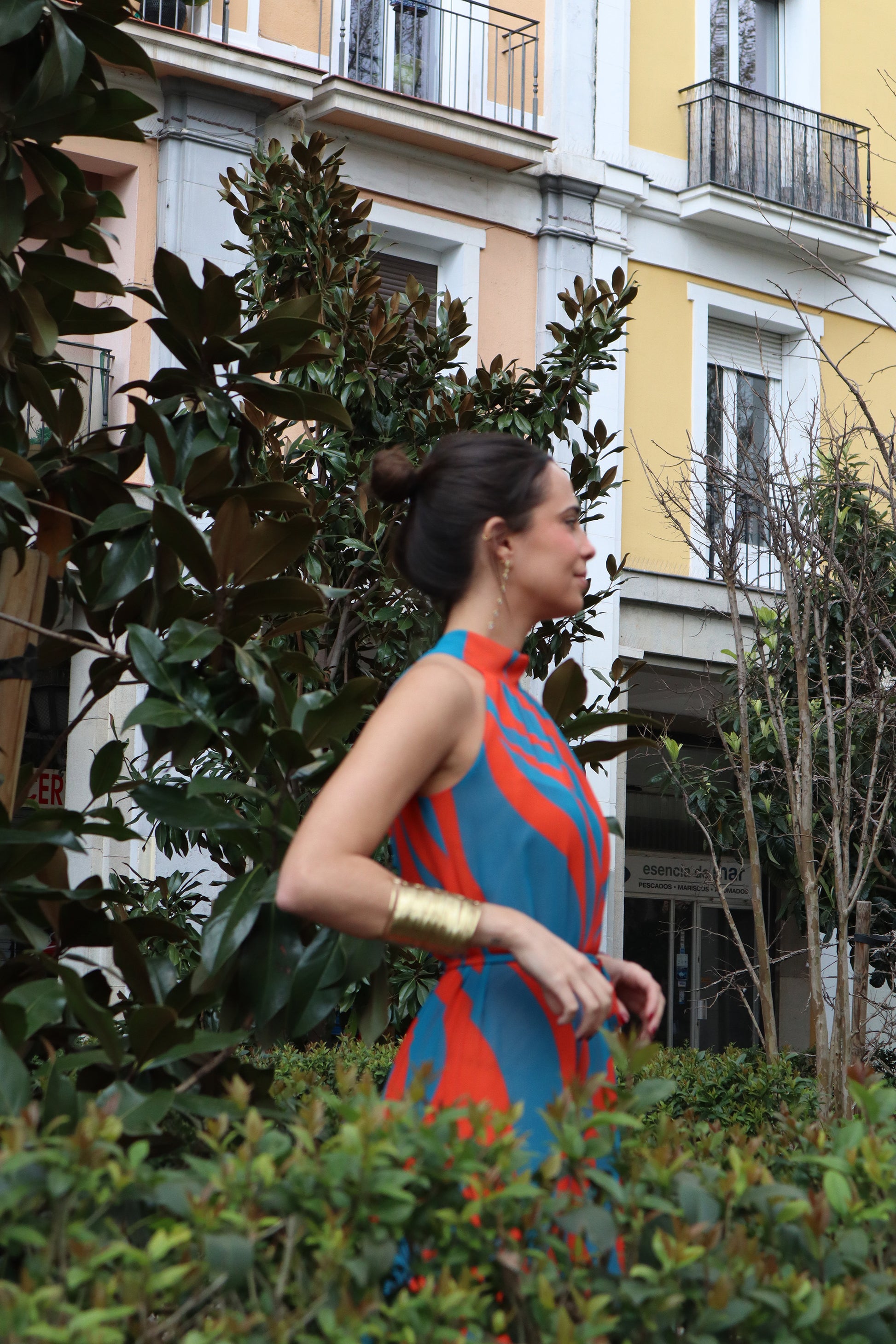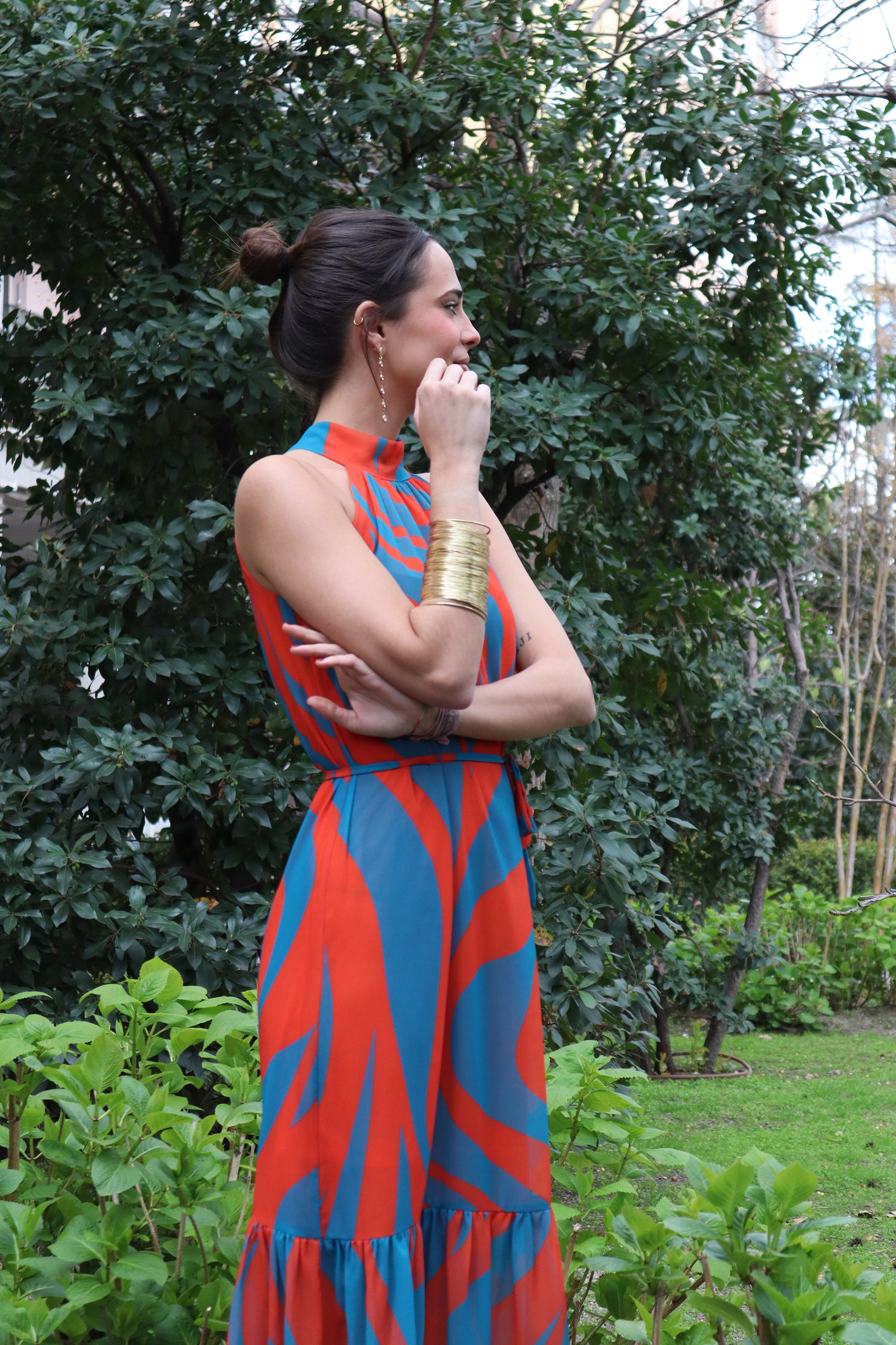 Vestido largo, con cuello halter y sin mangas, realizado en una gasa estampada de flores grandes naranjas, rosas y verdes y forrado. A la altura de la rodilla hay un gran volante hasta el tobillo donde acaba el forro. El vestido se abrocha con un nudo en la espalda e incluye un fino cinturón para poder entallarlo.