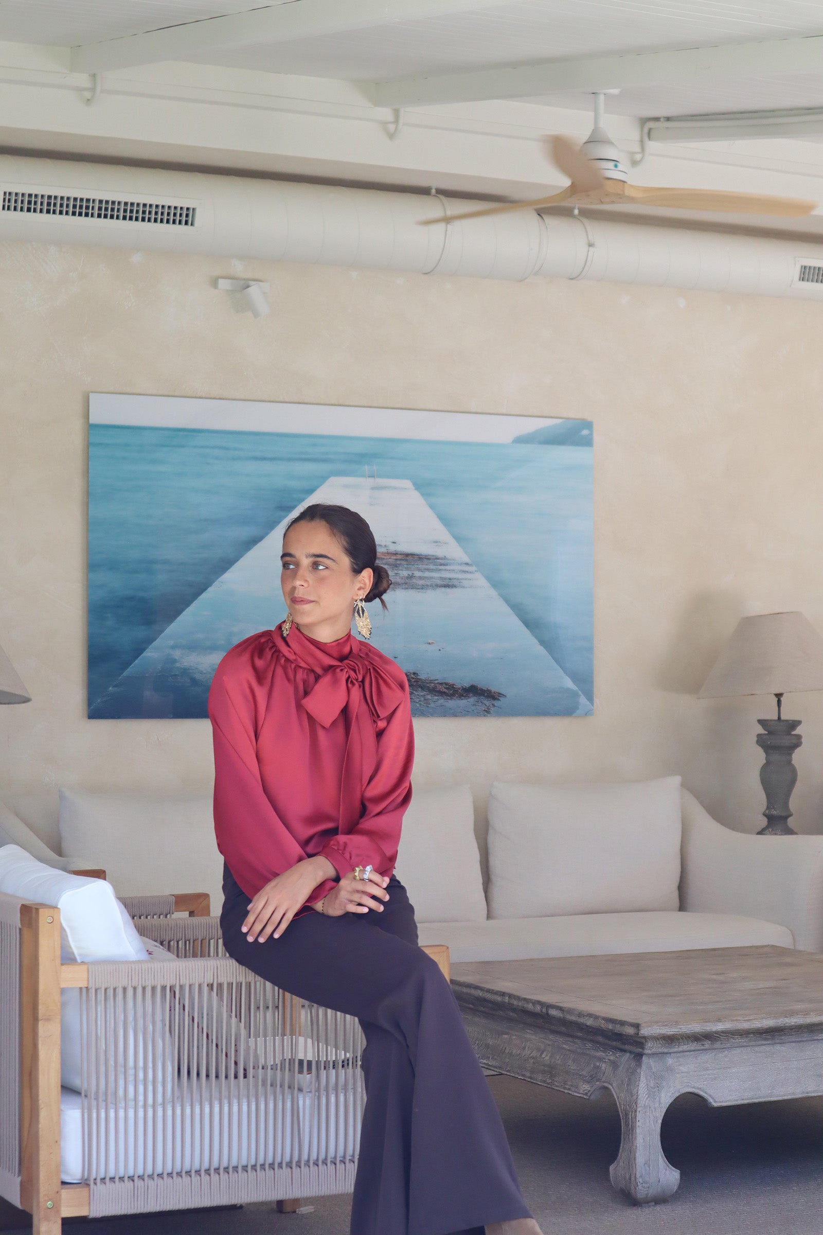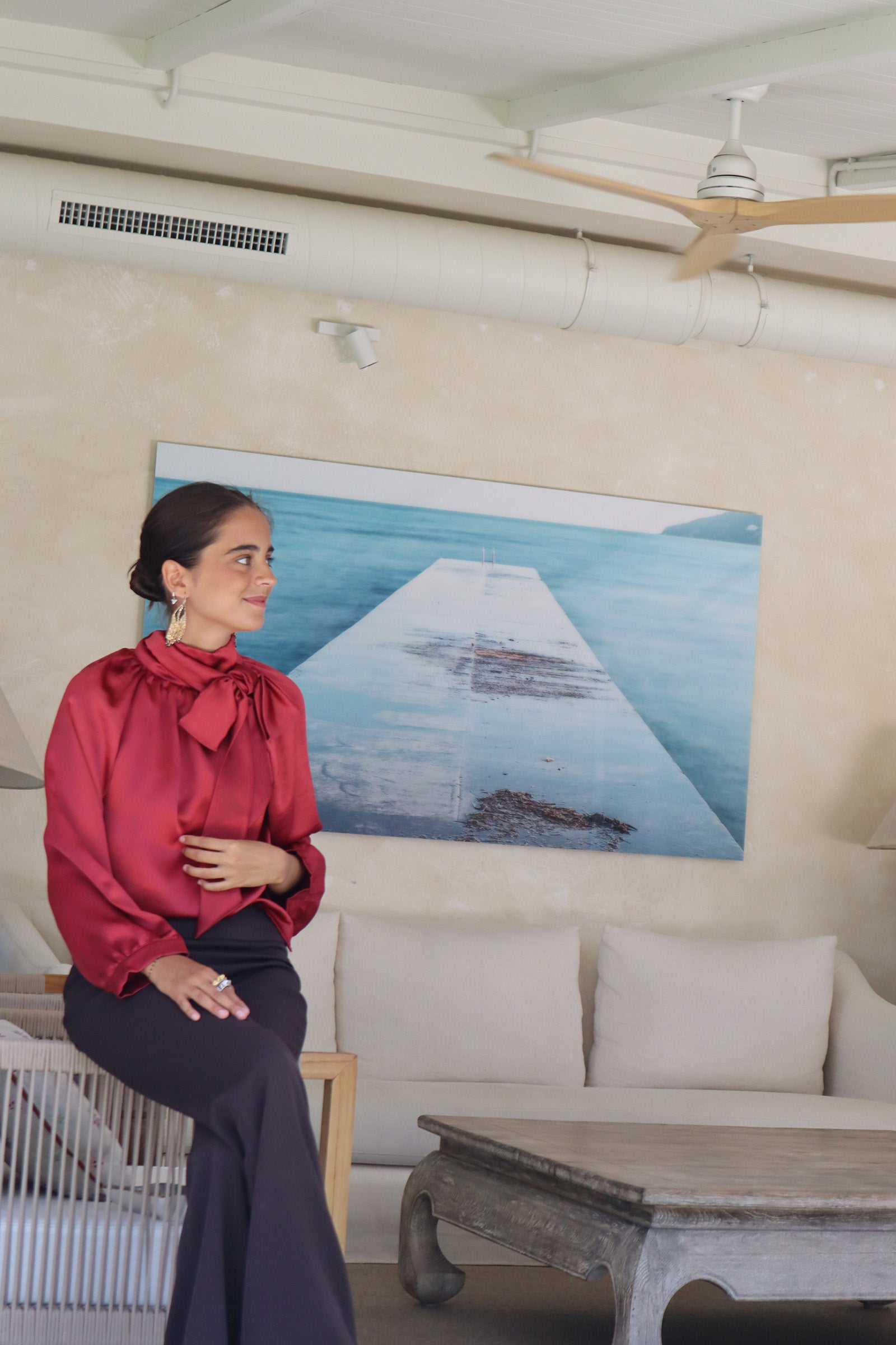 Camisa de manga ranglan, fruncida en el escote y fabricada en satén coral. El cuello se remata con un alzado que acaba en un lazo de 6 cm de ancho. El lazo se abrocha dándole la vuelta alrededor del cuello, para anudarlo por delante o en un lado. Las mangas abullonadas se rematan con un puño ancho sin botón. En la espalda hay una abertura que se cierra con el lazo y otras dos pequeñas en los laterales.