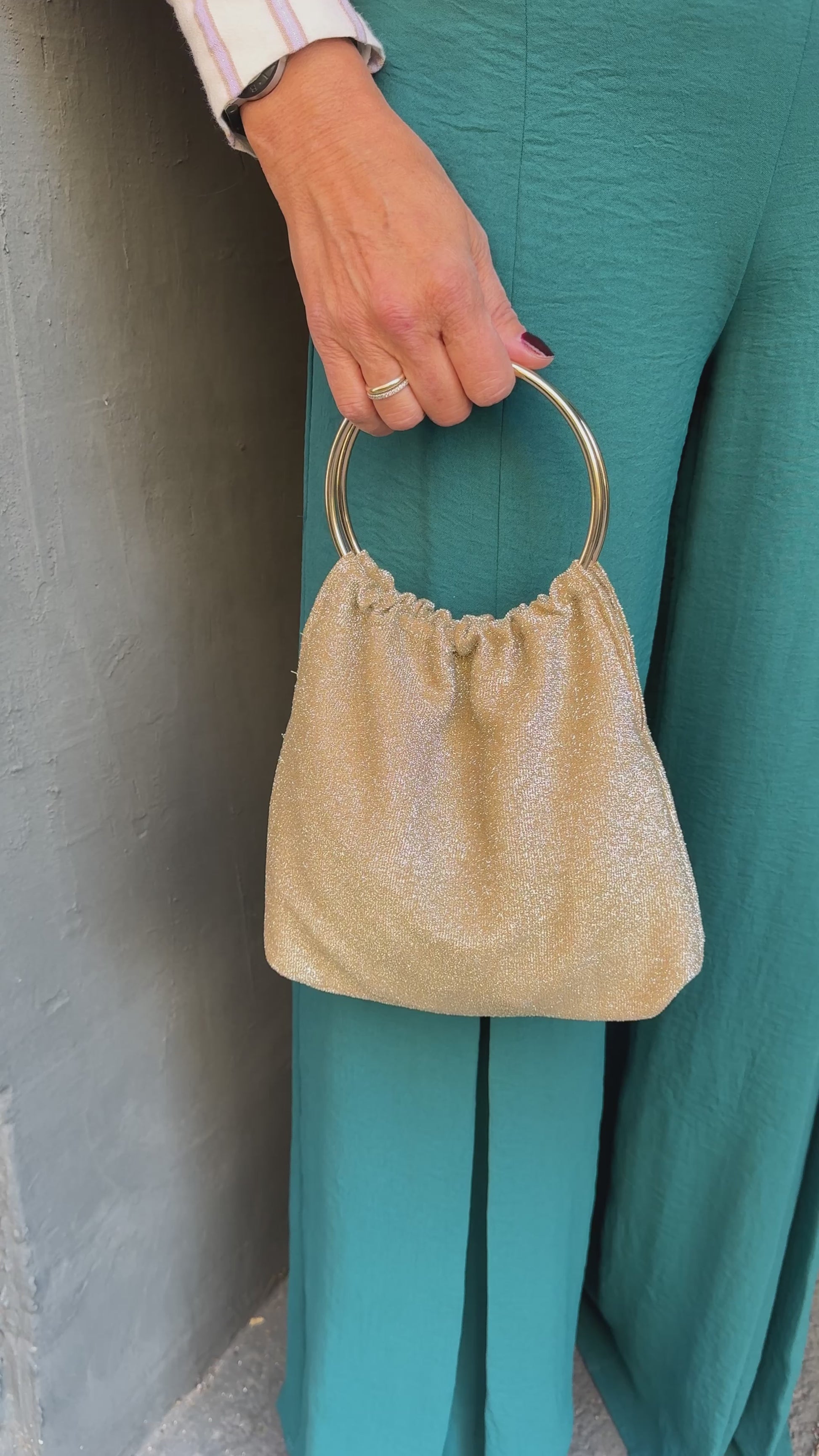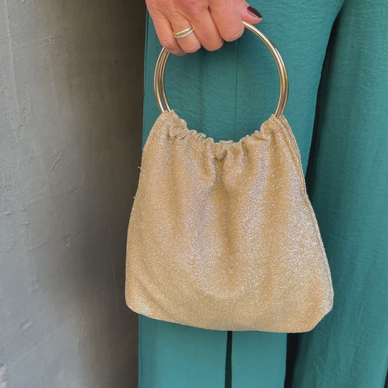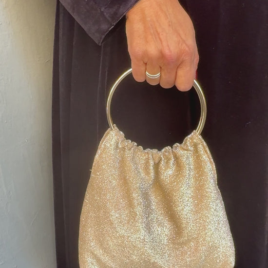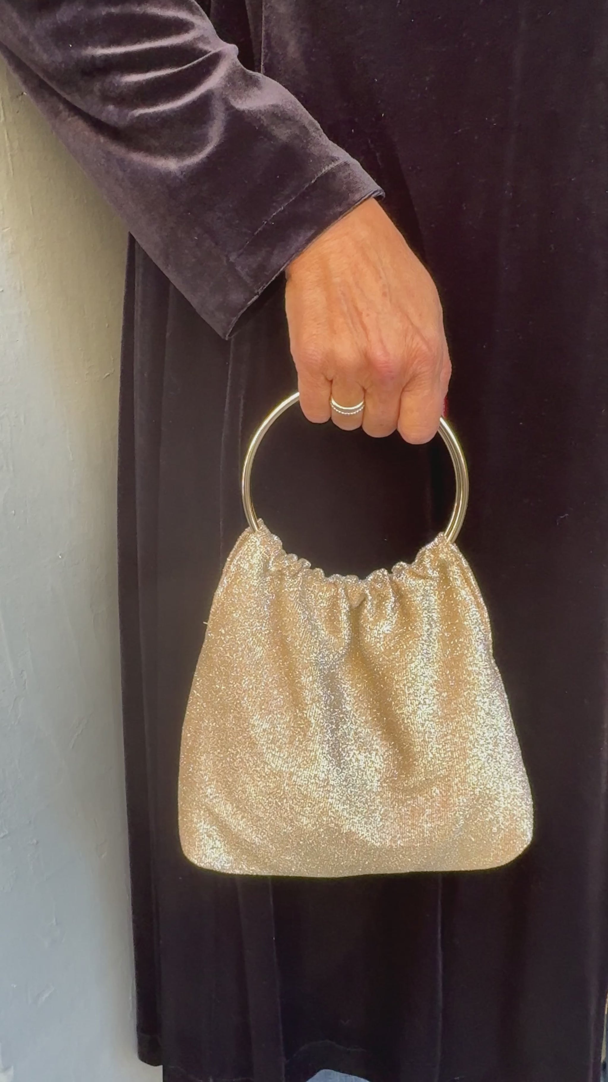 Bolsa em formato de saco, confeccionada em espuma elástica com lurex dourado e duas alças de metal banhado a ouro de 12 cm de diâmetro. Seu interior é forrado.