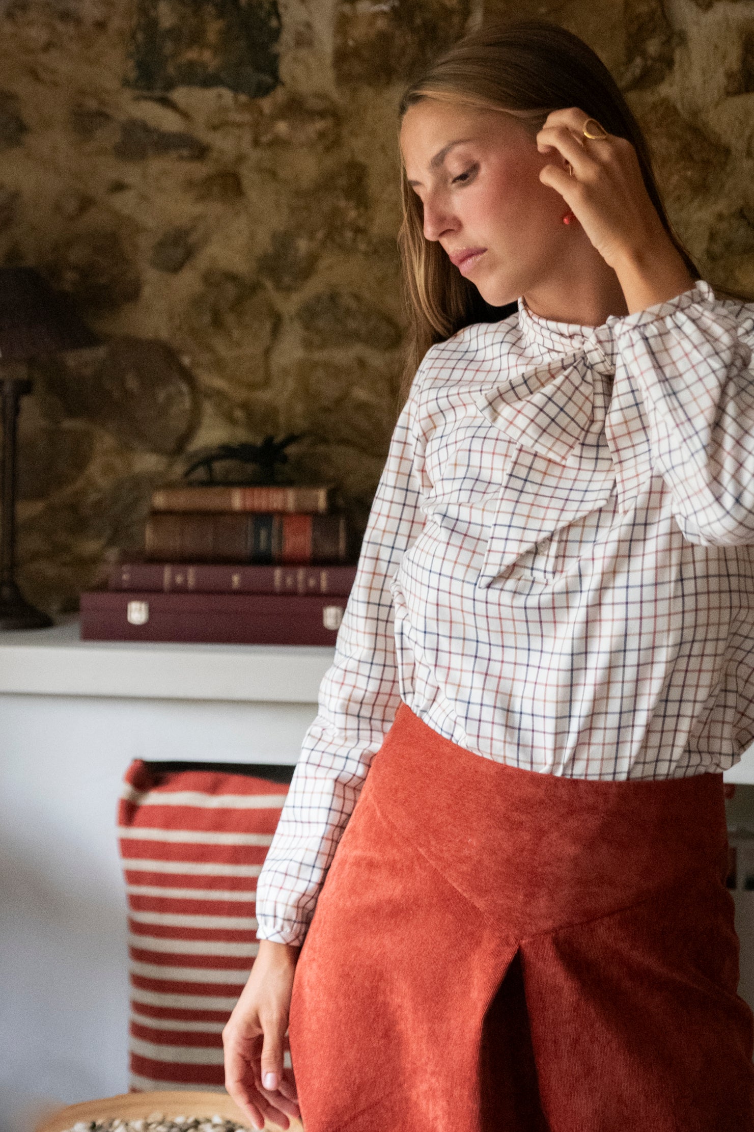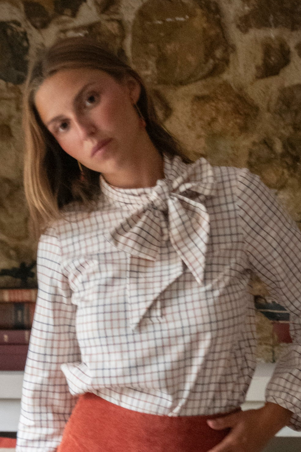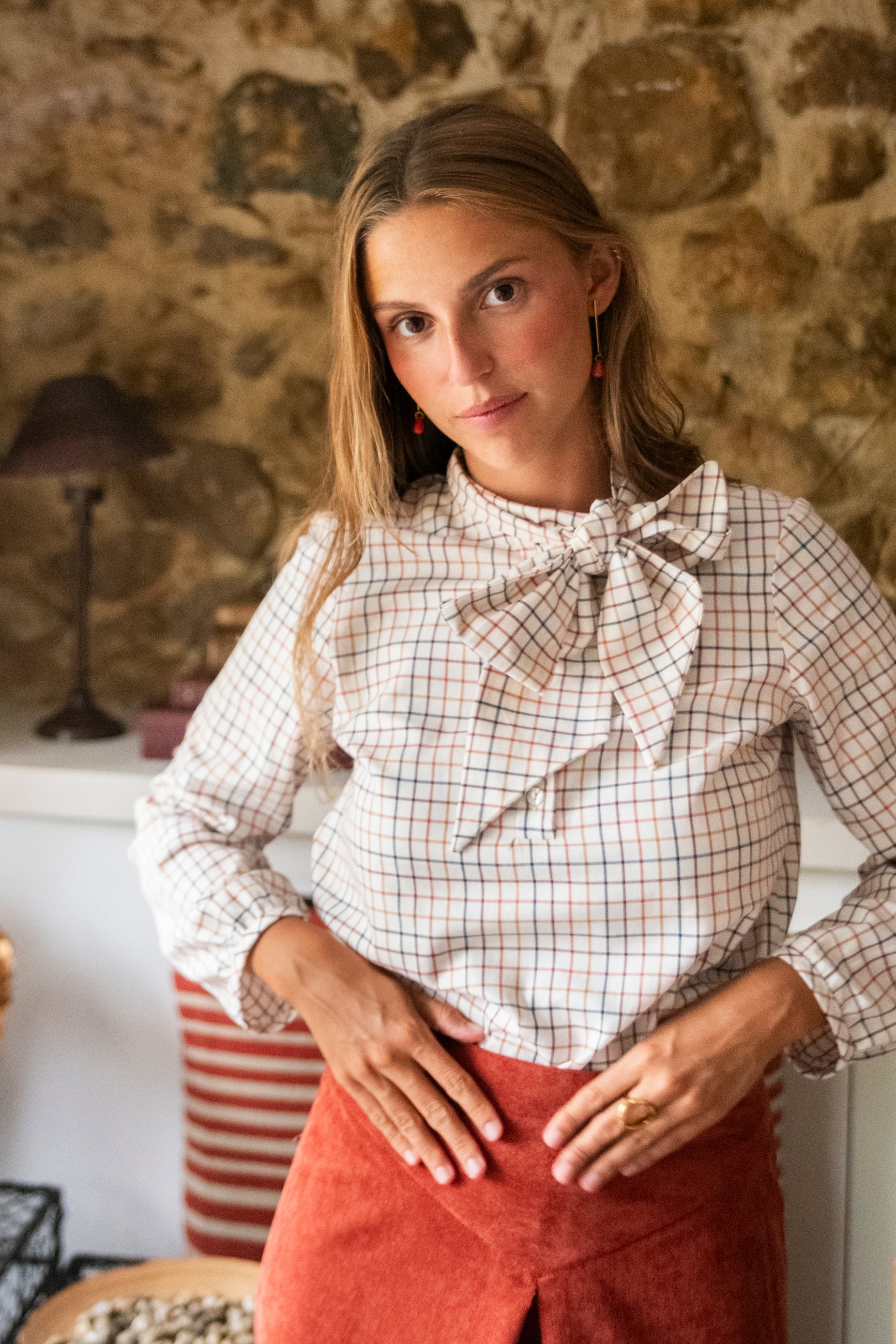 Camisa con cuello base y con una tapeta delantera con botones ocultos. En el cuello va un lazo cosido al cuello para atarse por delante. A la altura del pecho hay dos pinzas y la espalda tiene canesú. El bajo es recto y es más corto por delante que por detrás. Está fabricada en un tejido de viyela de cuadros leñador.