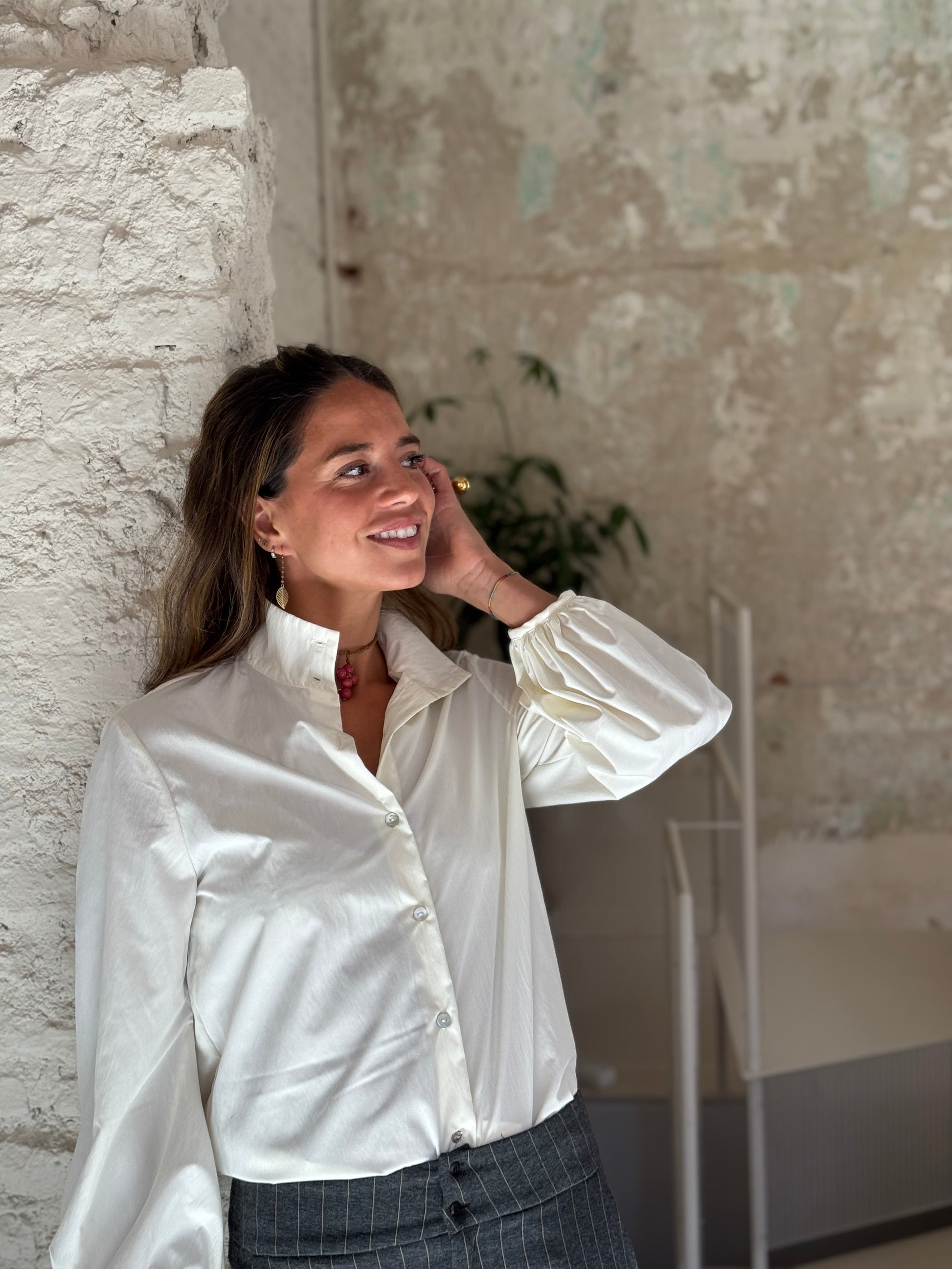 Camisa recta, abierta con botones de nácar y con un cuello mao alto que se puede cerrar con dos botones o dejarlo abierto quedando así, el cuello subido por la nuca que es muy favorecedor. Sus mangas globo, rematadas con un bies, la hacen muy especial. Está realizada en un popelín beige.