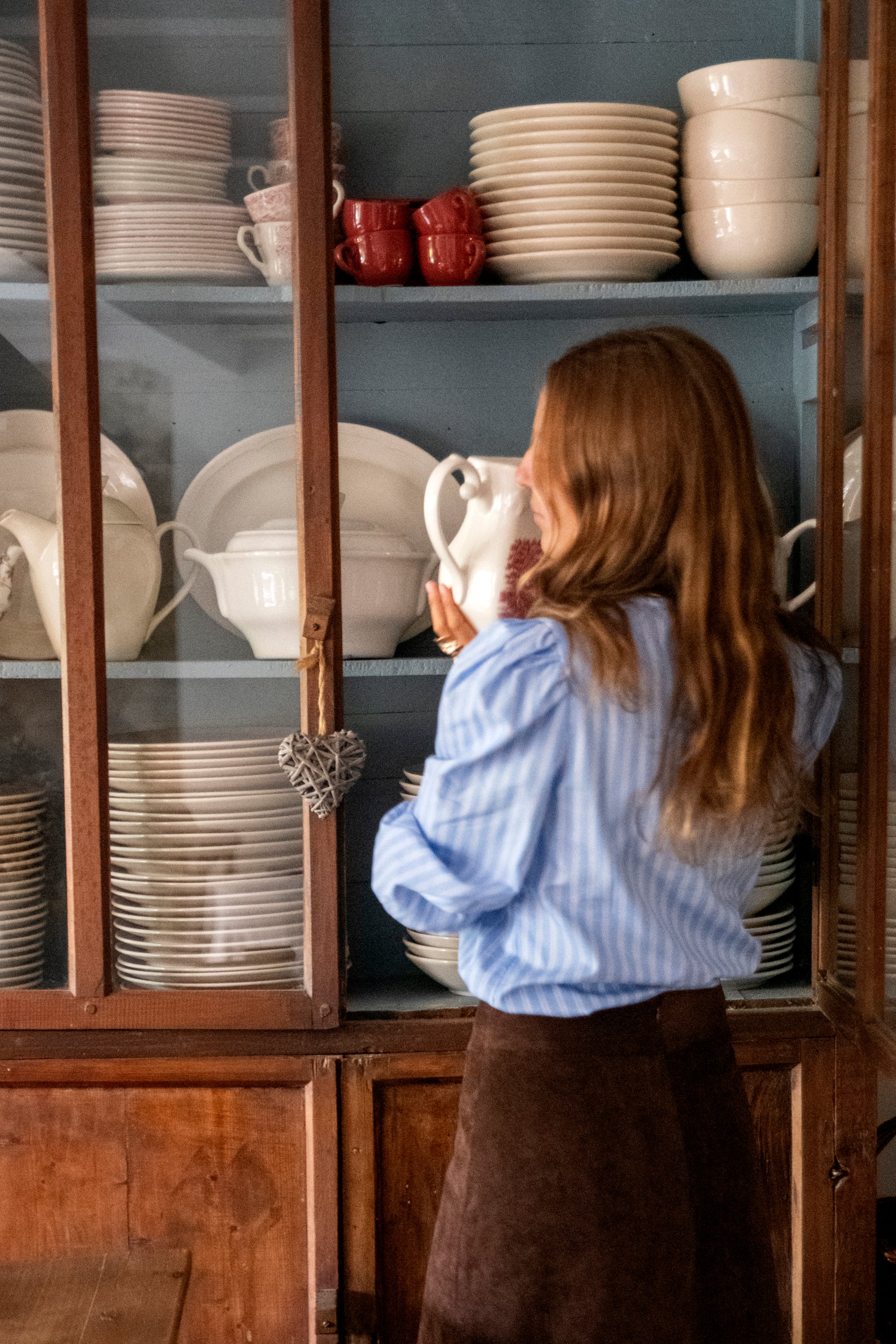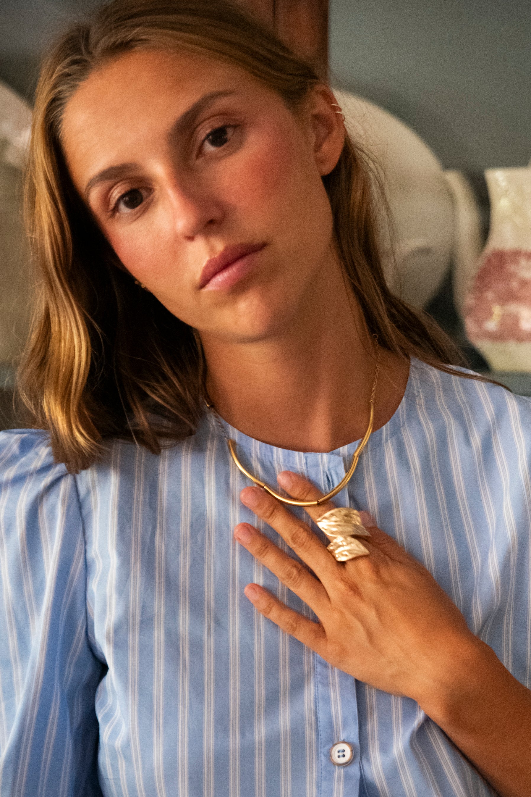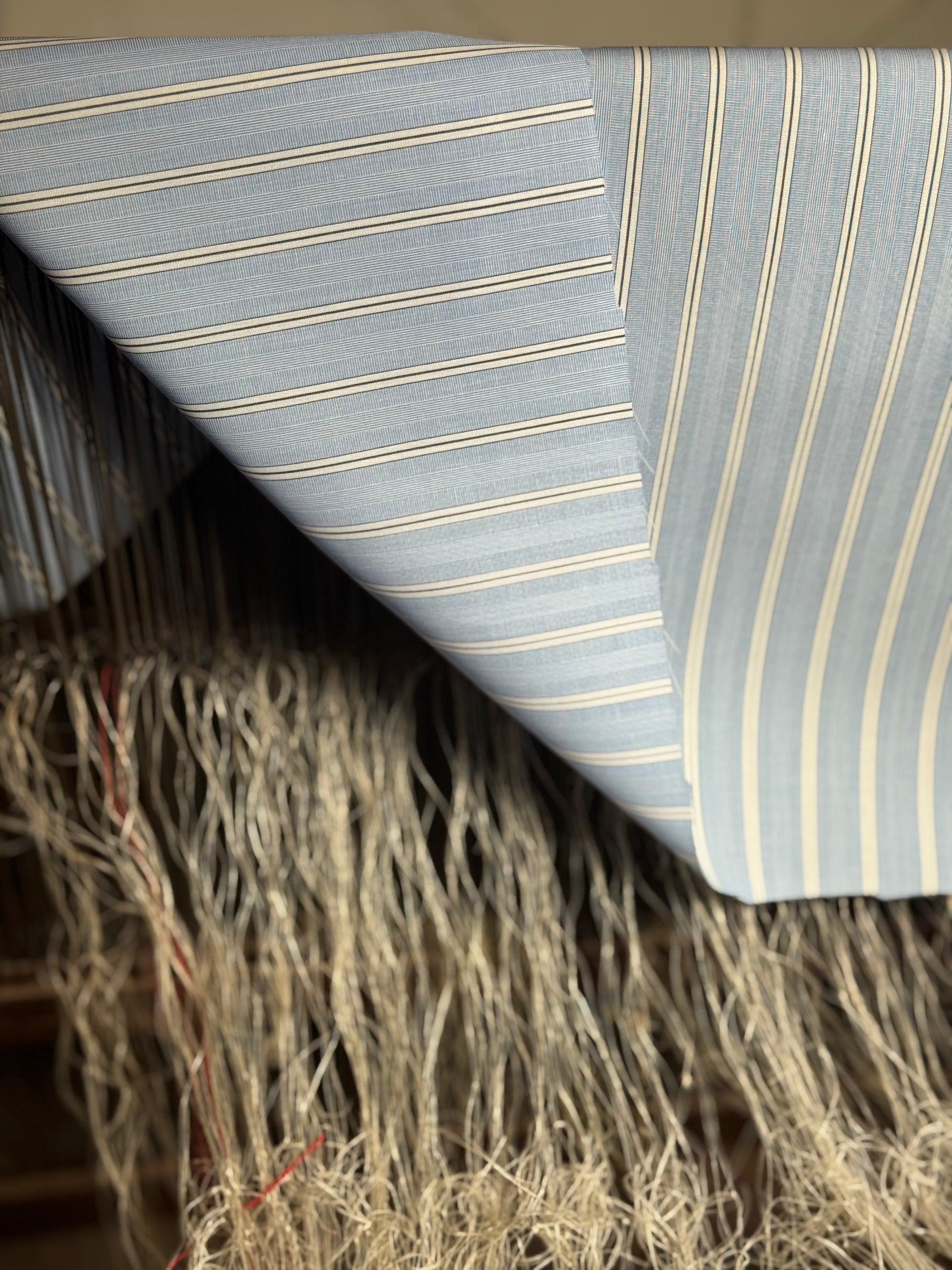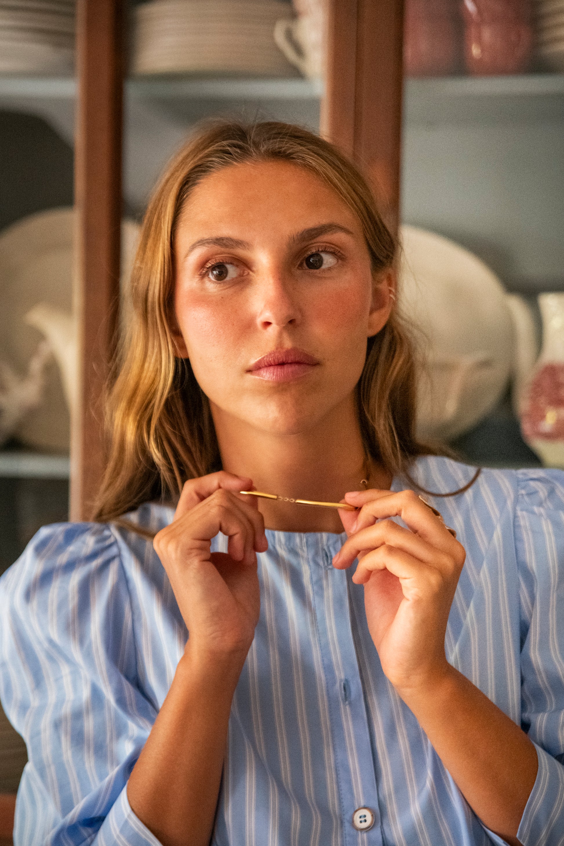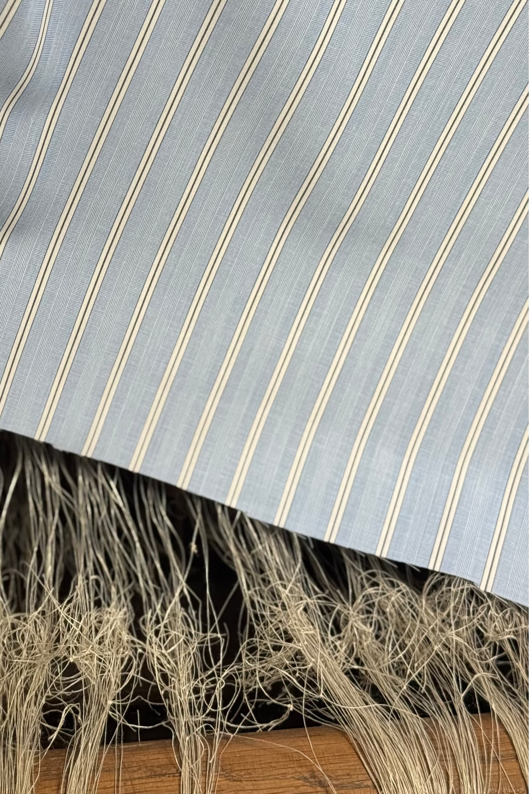 Camisa abierta recta con cuello caja y con dos pinzas en el pecho. Las mangas fruncidas, acaban con puño de 15 cm y con una pequeña abertura. Los botones son de madera con el interior en blanco y el bajo es recto con dos aberturas laterales. Su espalda también recta, sin canesú. Está fabricado en una batista de rayas celestes de algodón.