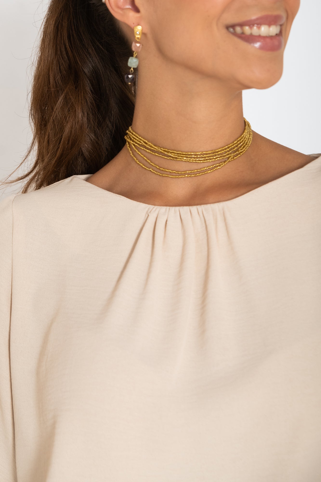 - Tecido: Bege fluido com ótima queda e quase sem rugas.