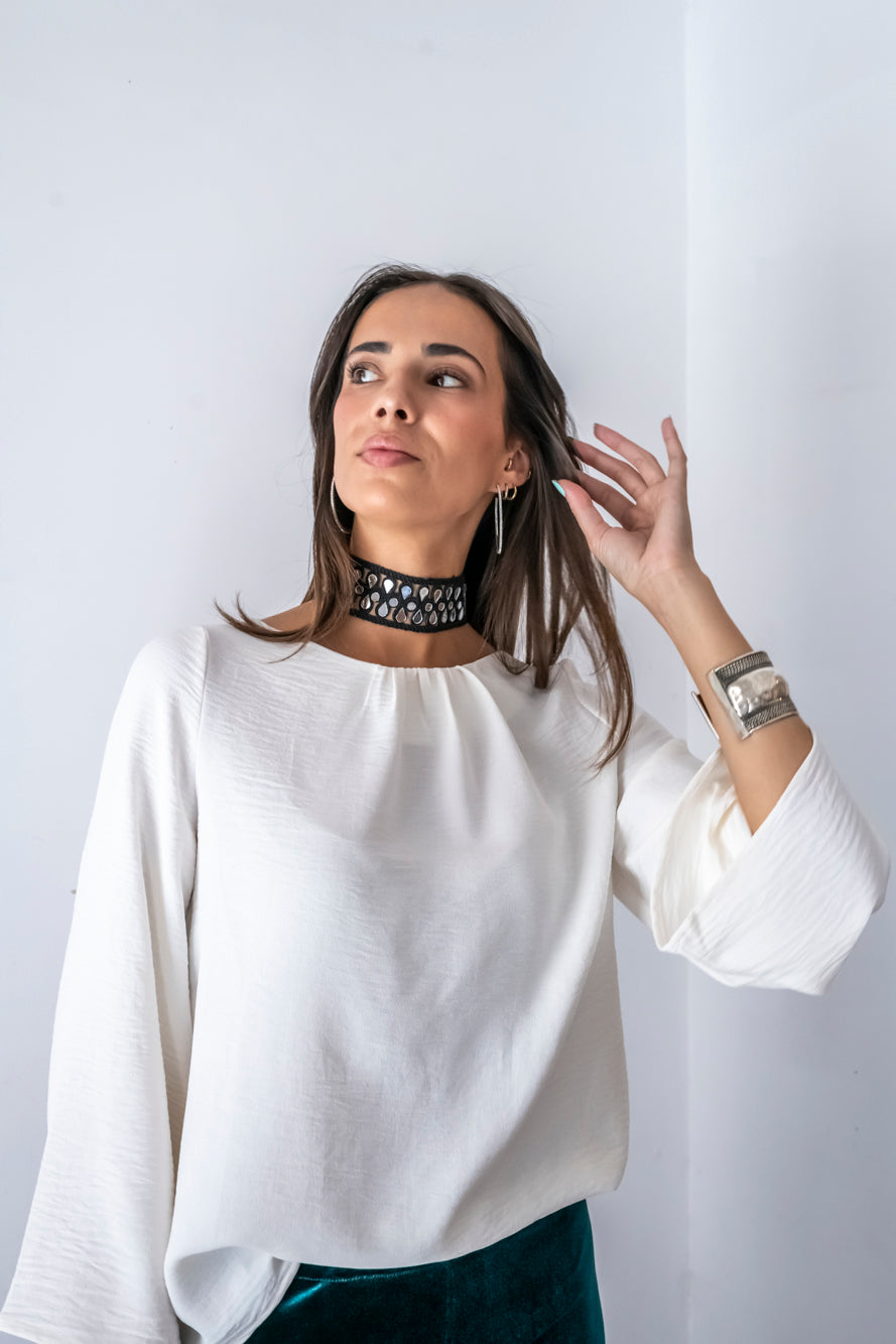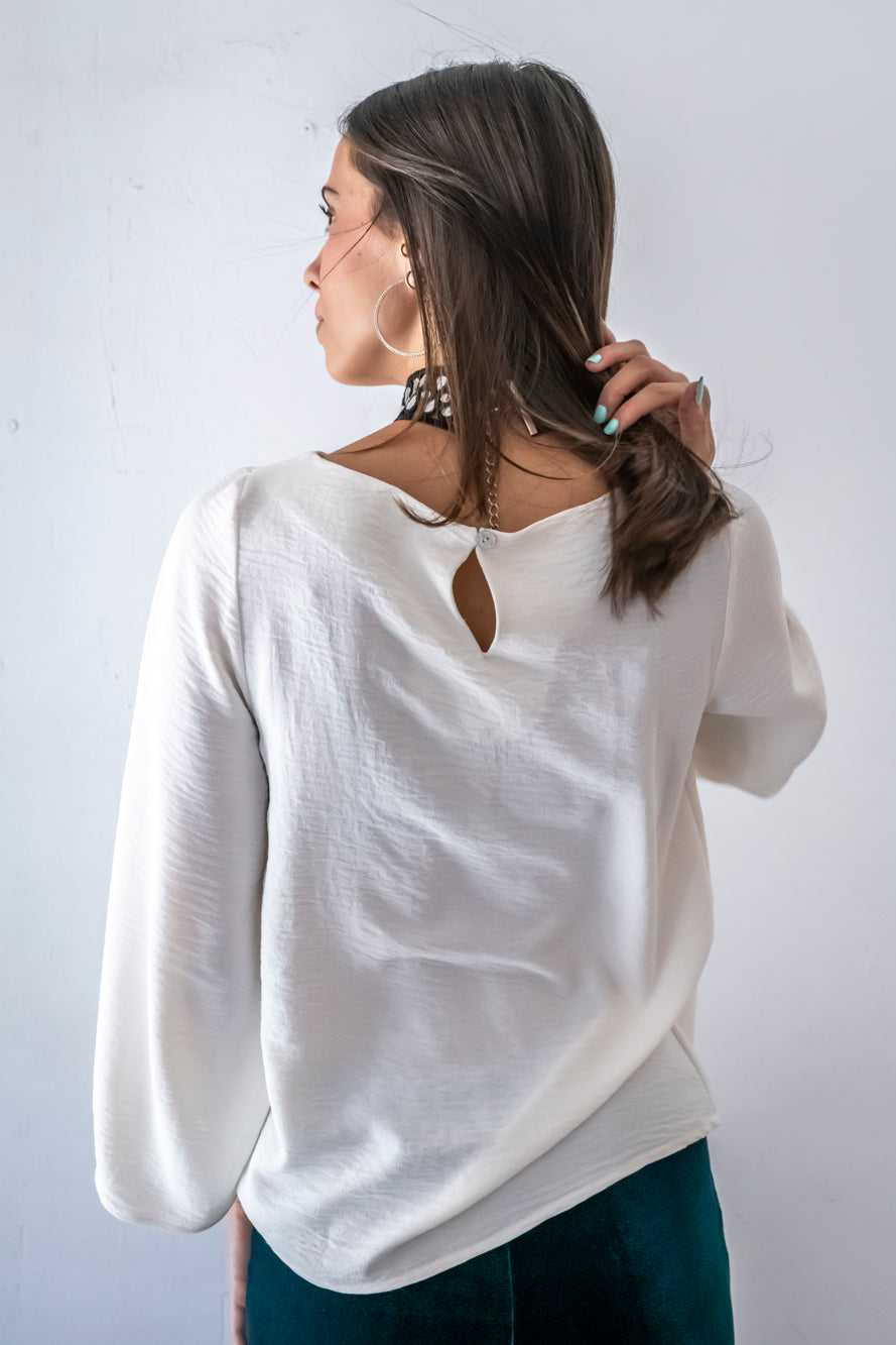 -Camisa de corte reto com gola quadrada e franzido central.