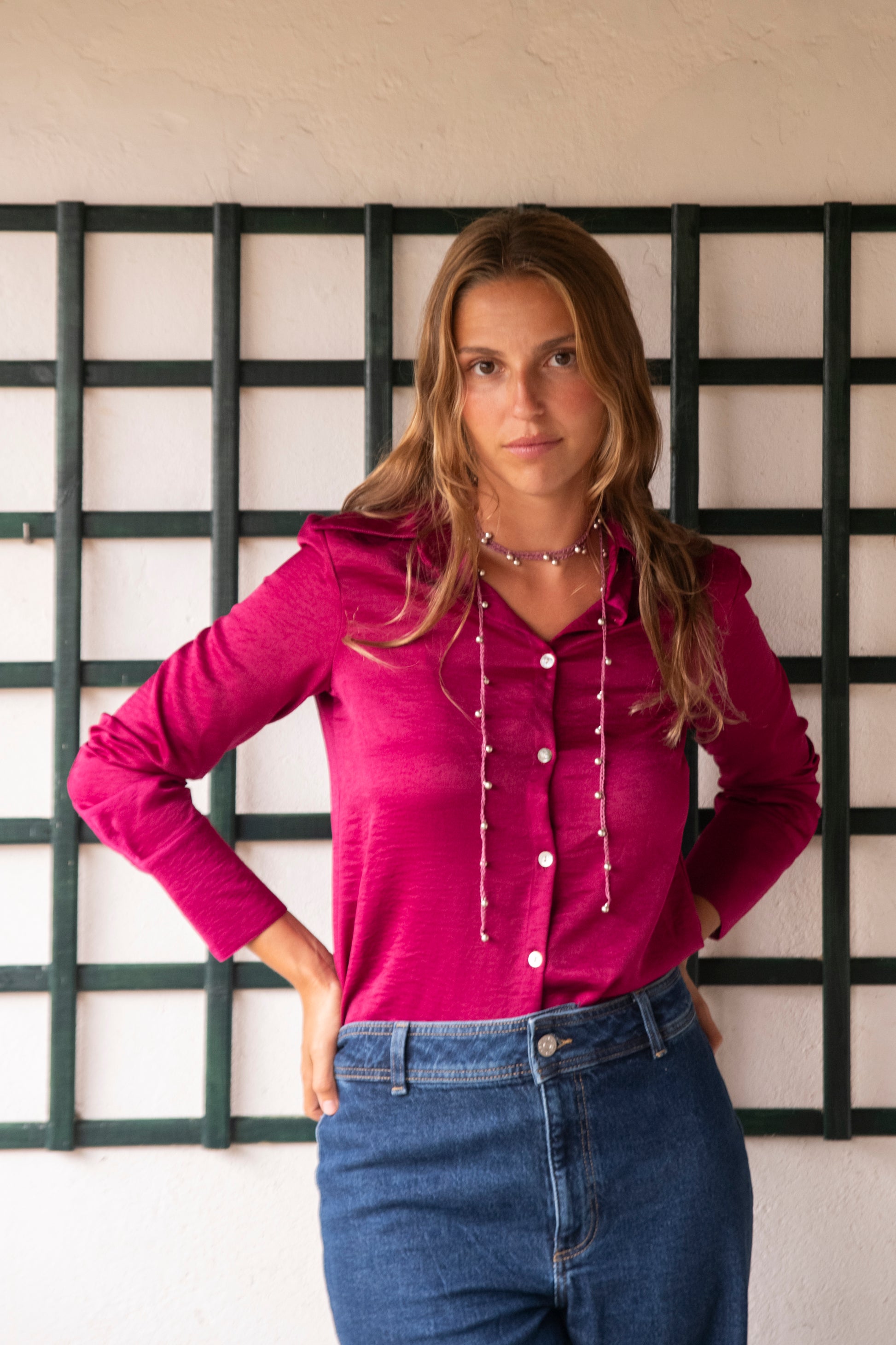 Camisa camisera con cuellos muy pronunciados y puño camisero con doble botón de nácar. Tiene la espalda con canesú. El bajo está redondeado y la camisa es más larga por detrás. Está fabricada en un satinado buganvilla.