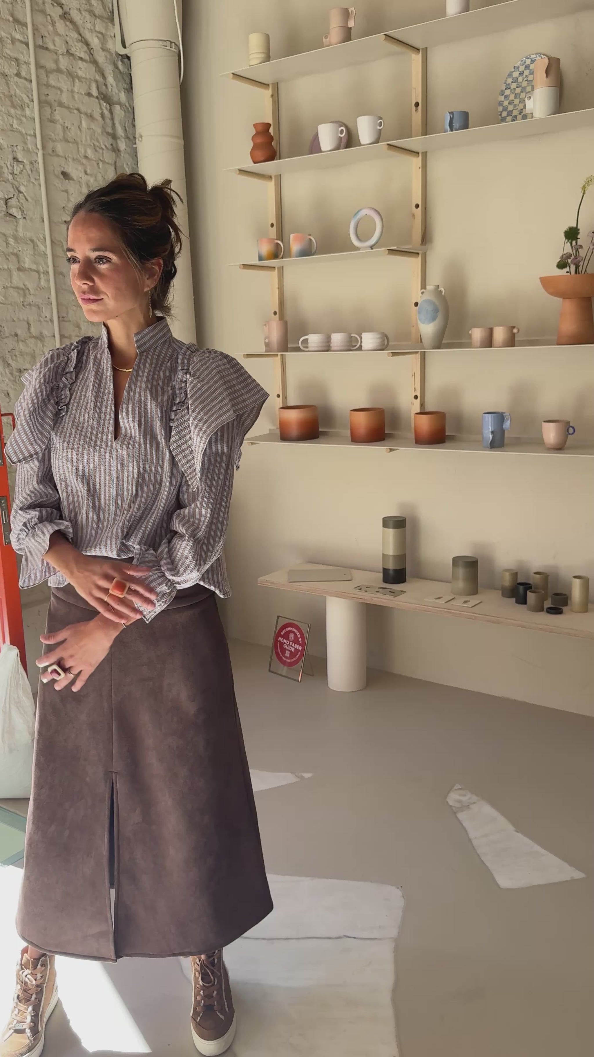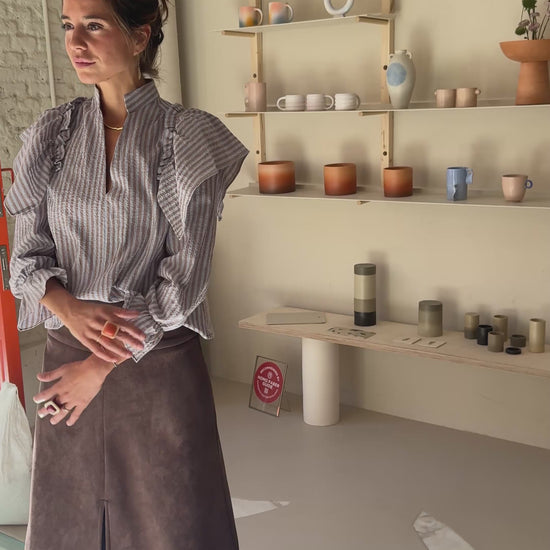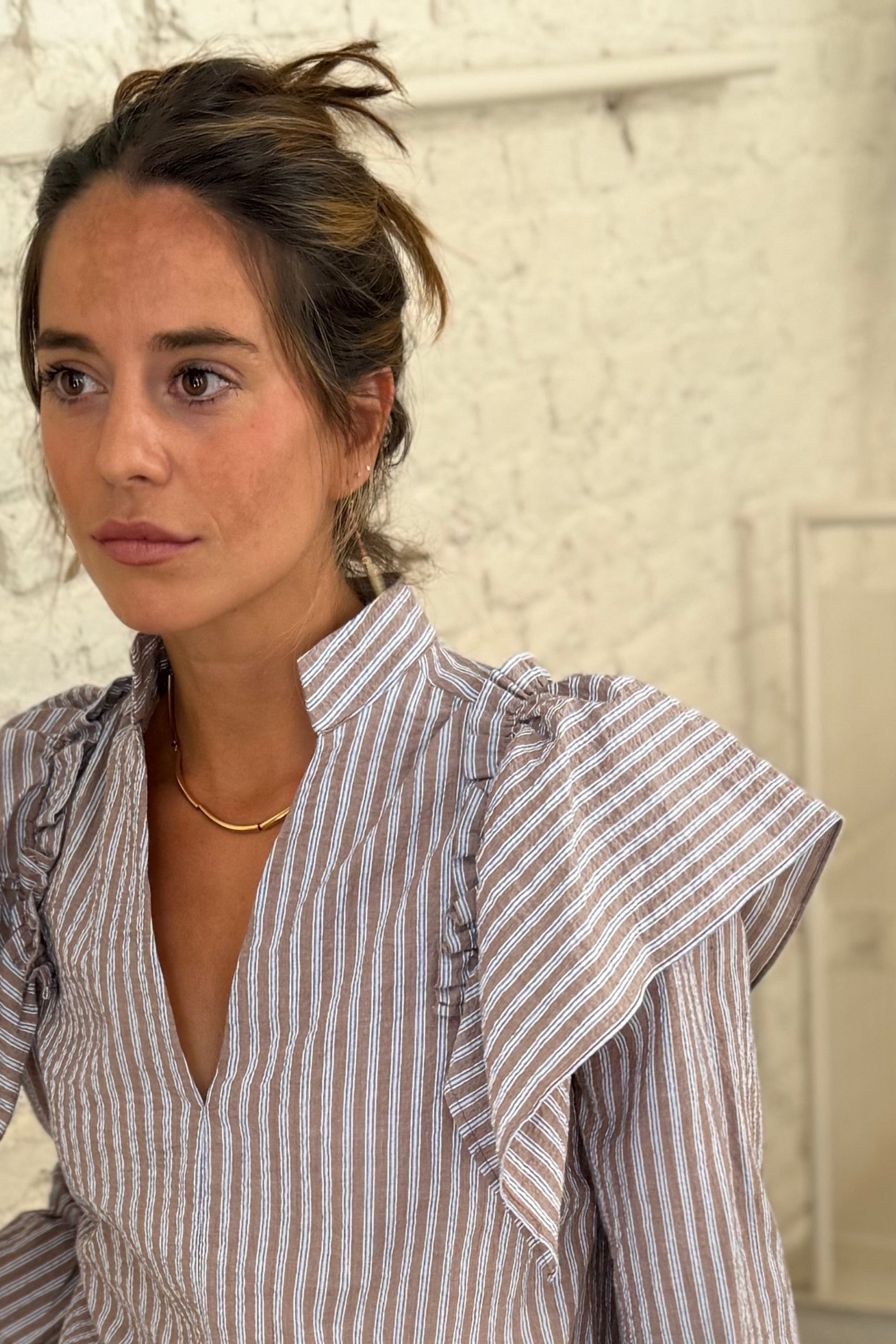 Camisa fruncida desde el hombro, con cuello mao y con dos alerones cosidos con pestaña. Tiene una costura central delantera, canesú en la espalda y la manga larga que se remata con un volante. Está confeccionada en un tejido de sersúker de rayas topos y azules, muy cómodo ya que no se arruga y casi no necesita plancha.