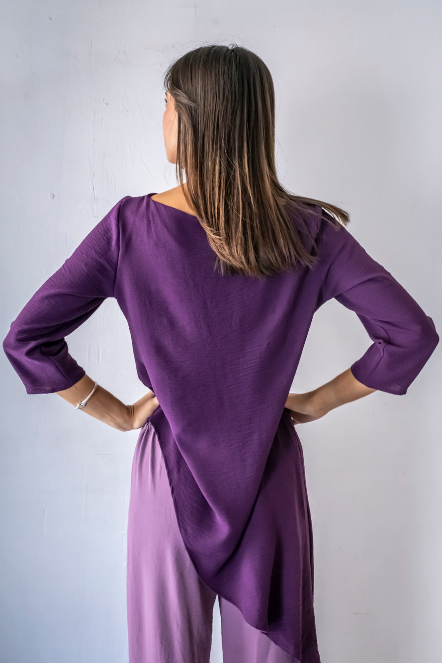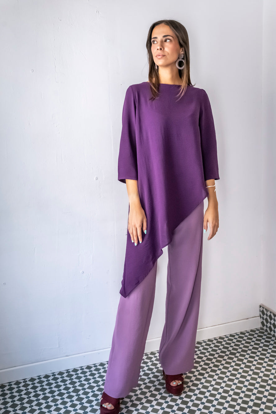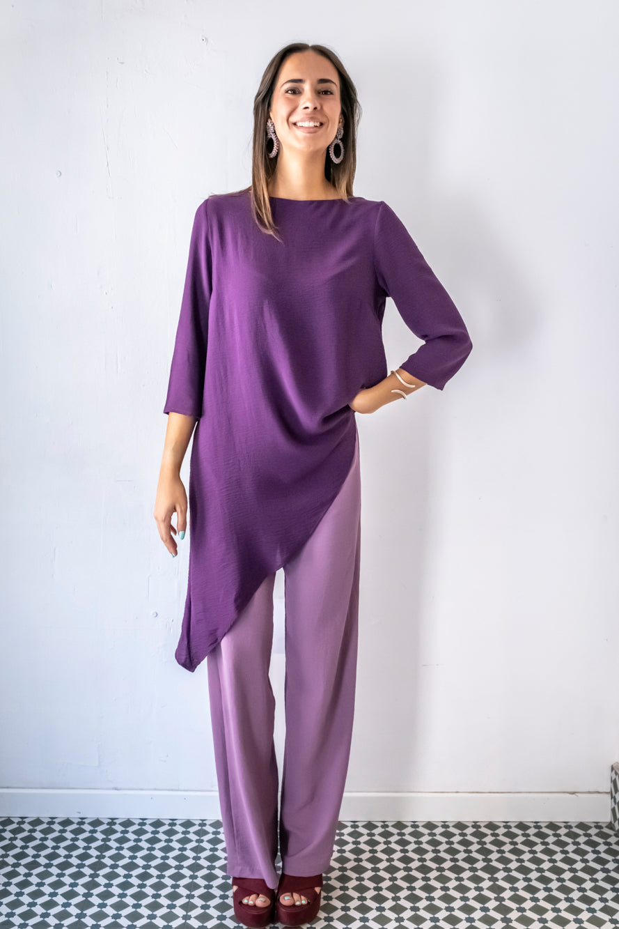 Casaca larga asimétrica, con cuello barco y mangas rectas. Se abrocha en la espalda con un botón. Está fabricada con un fluido morado con mucho movimiento. Se puede completar el look con el pantalón malva Noruega malva, que está disponible en web.