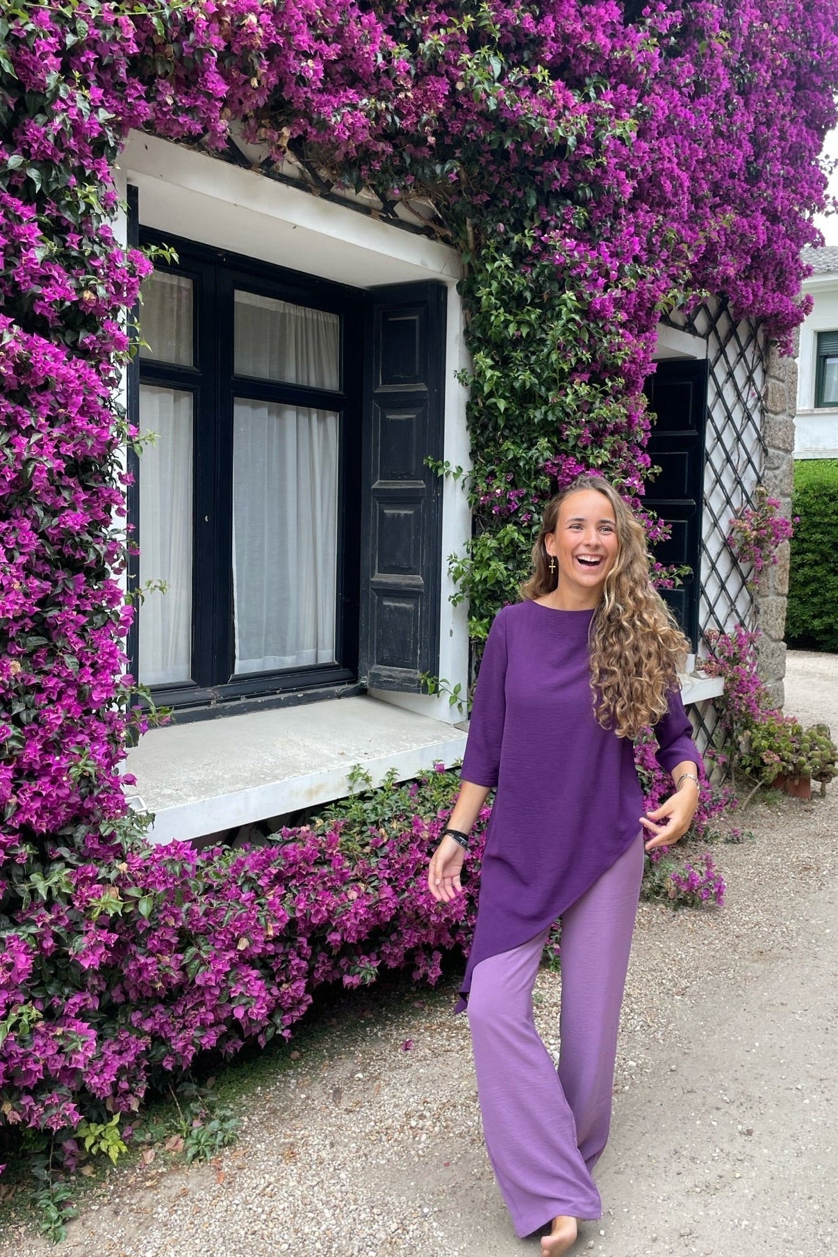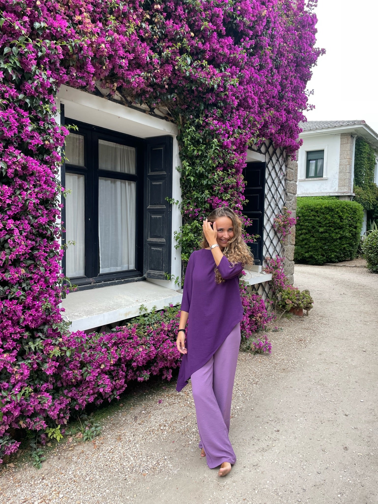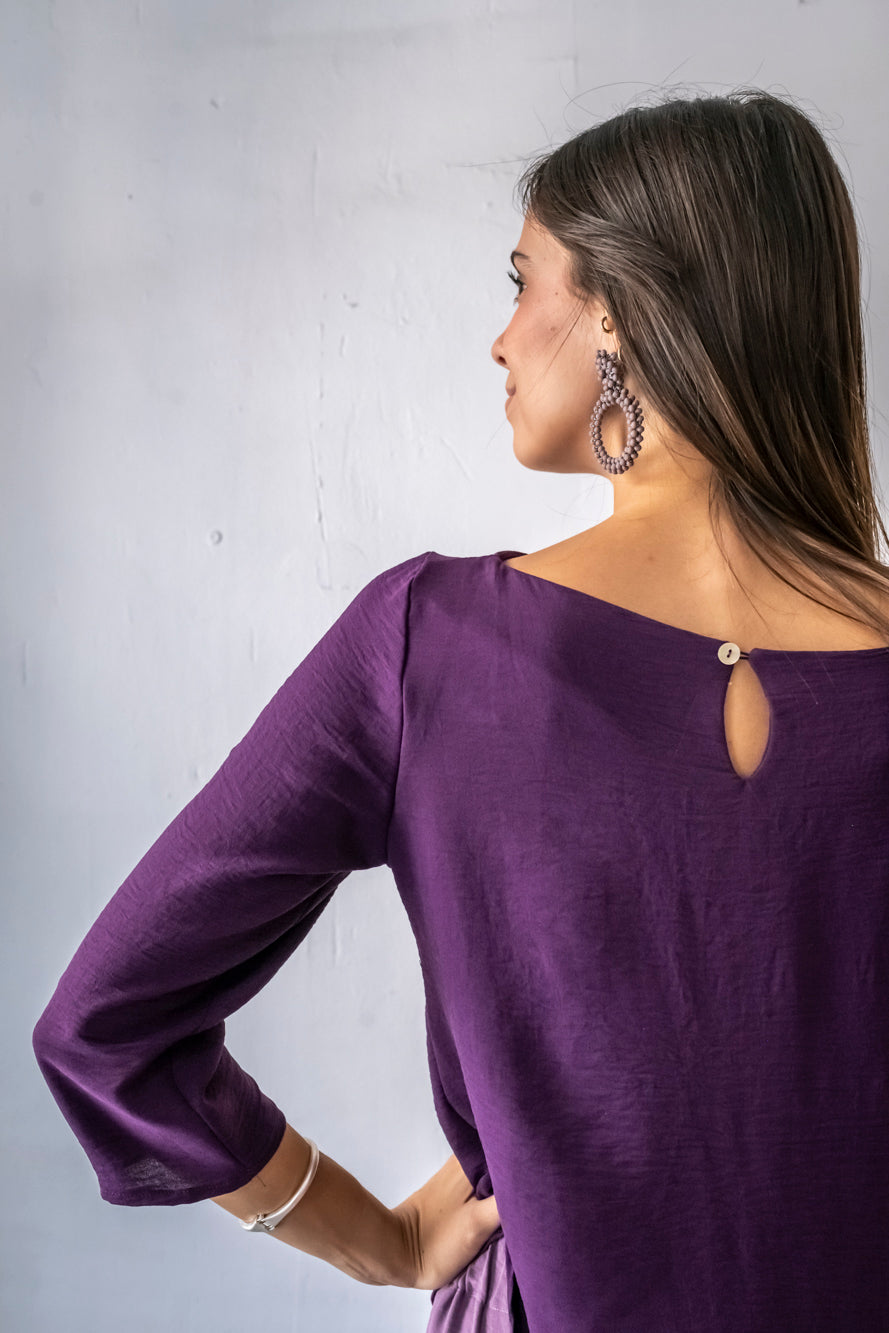 Casaca larga asimétrica, con cuello barco y mangas rectas. Se abrocha en la espalda con un botón. Está fabricada con un fluido morado con mucho movimiento. Se puede completar el look con el pantalón malva Noruega malva, que está disponible en web.