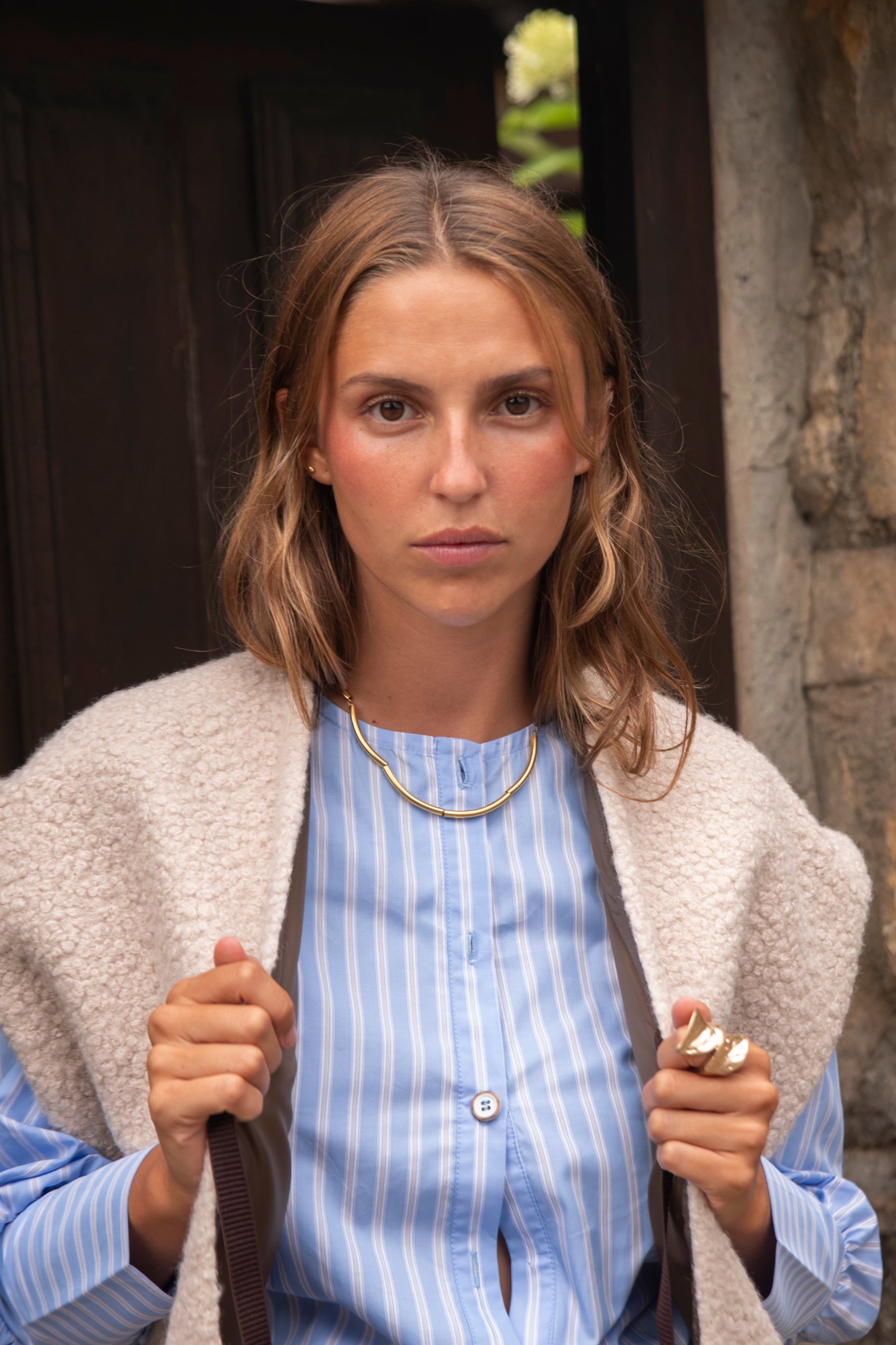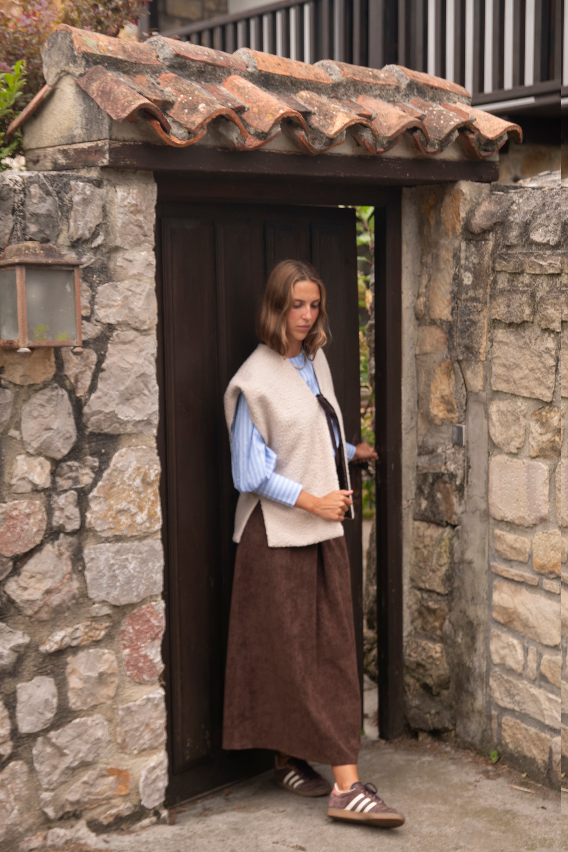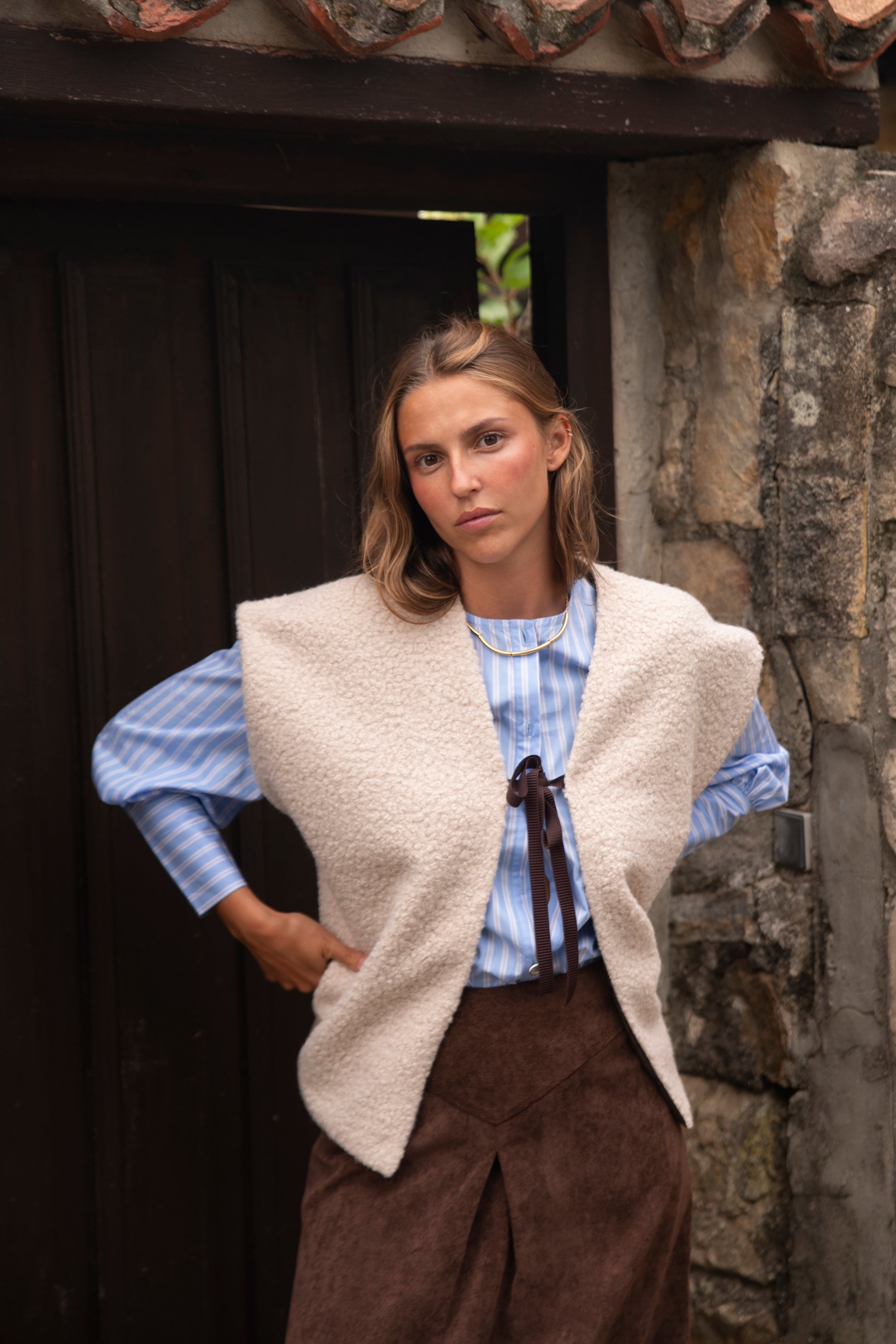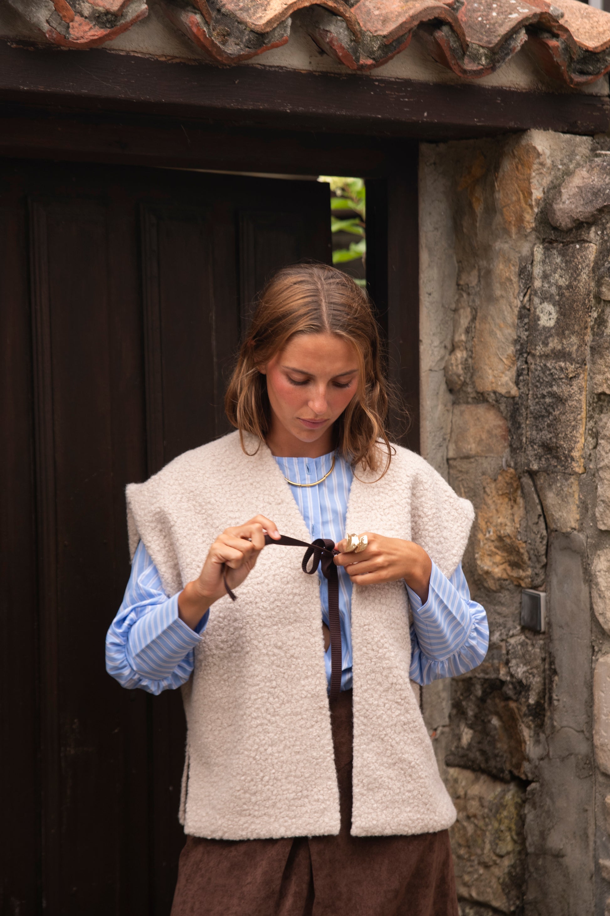 Chaleco de color natural con un corte recto y estilo minimalista. La textura del exterior es suave y mullida con el efecto rizado característico del tejido tipo borrego. El interior está forrado en tono marrón aportando mas estructura a la prenda. En la parte frontal lleva un lazo marrón como único cierre. El diseño de los hombros con una caída recta, le aportan un toque moderno y versátil, ideal para looks casual de entretiempo o de invierno, fácil de combinar sobre camisas, vestidos o jerséis.
