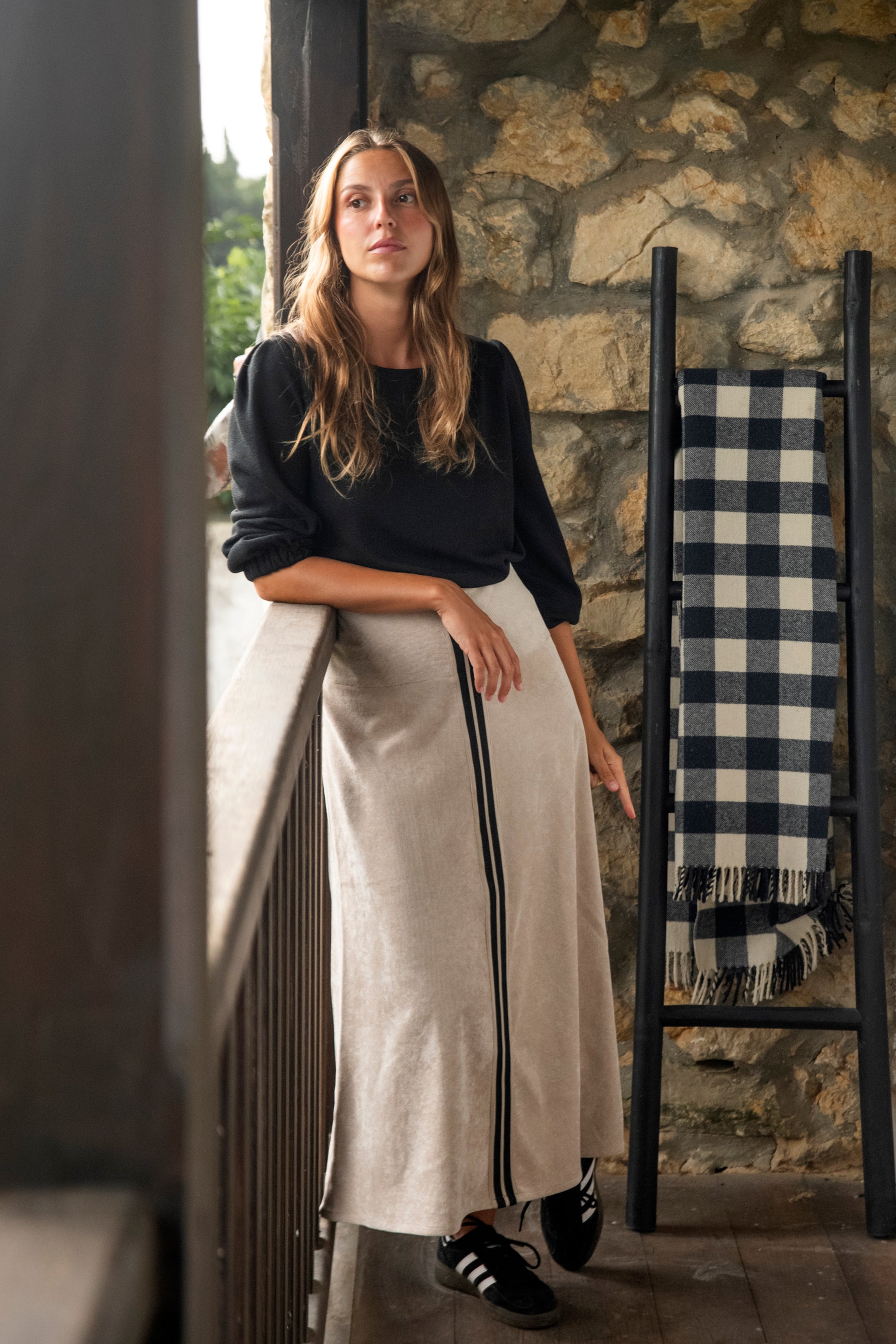 Falda midi acampanada con una cinturilla muy ancha (12 cm) que abrocha detrás con cremallera. Resalta el adorno de la cinta negra y hueso, desde la cintura hasta el bajo. Tiene una forma acampanada con una abertura en la parte trasera. Es una falda concebida para sujetarla en la cadera. Está realizada en pana técnica beige muy agradable al tacto.