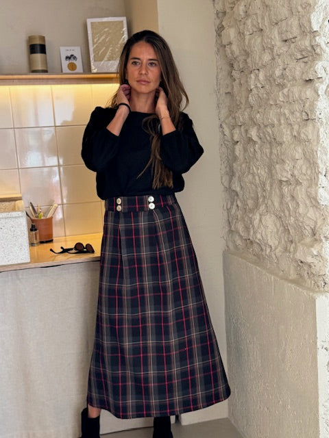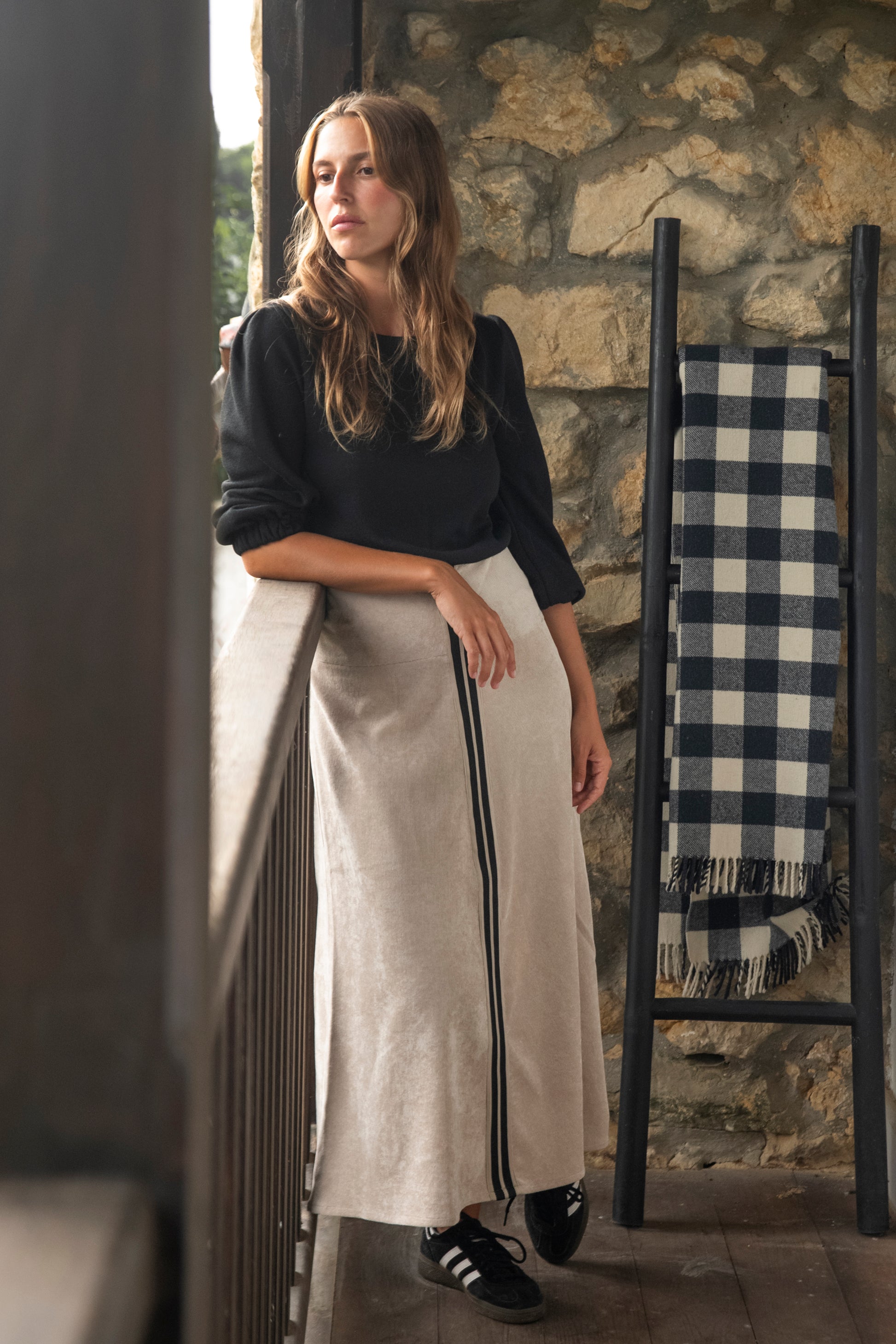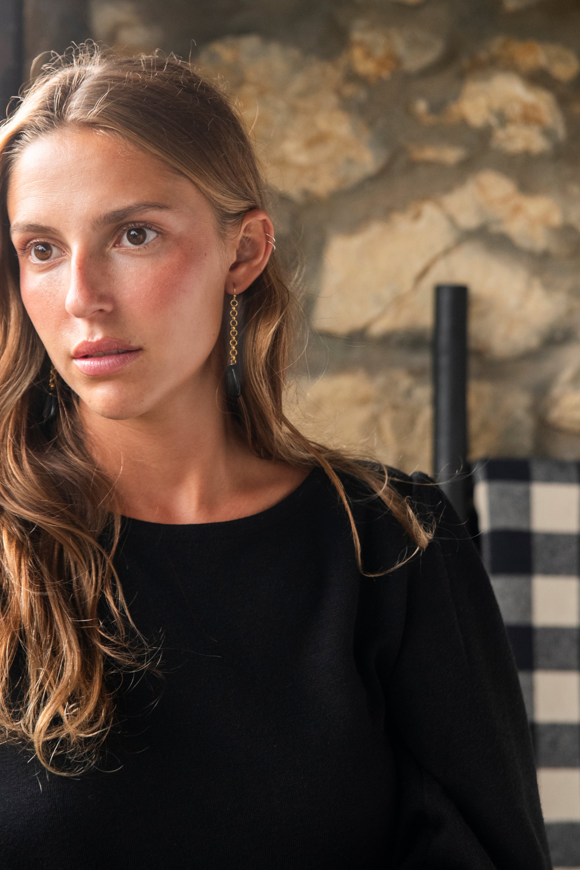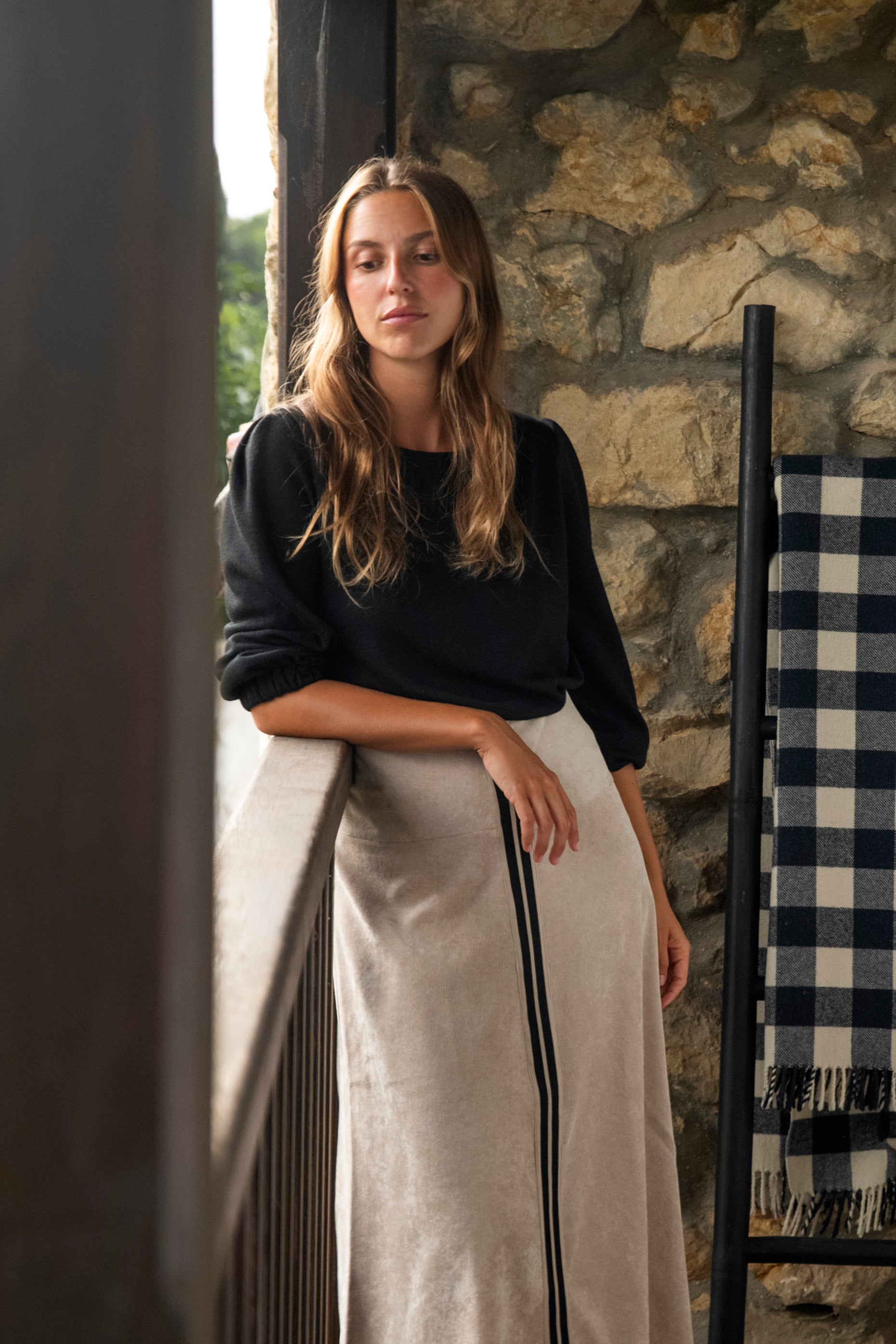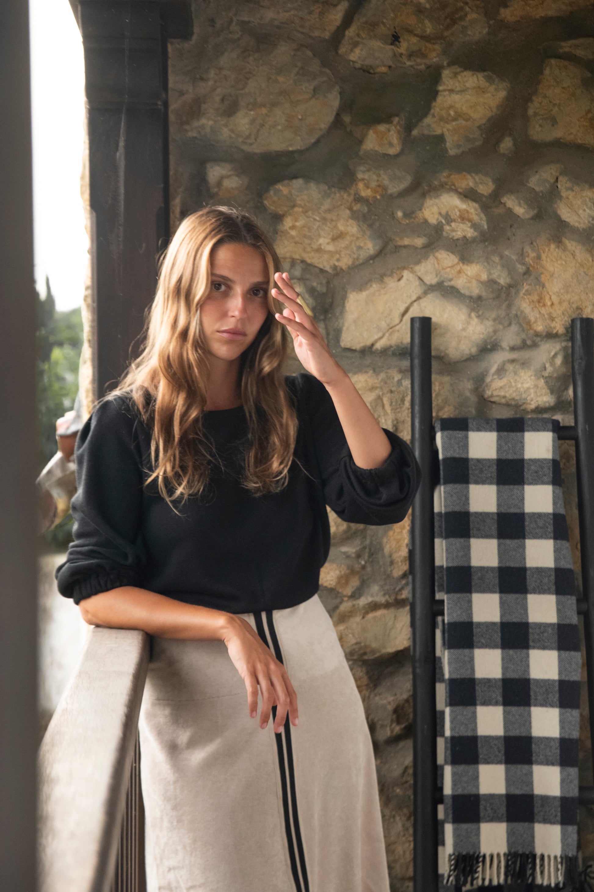 Jersey recto con cuello de barco. Tiene las mangas fruncidas en el hombro y se rematan con un elástico de 2 cm. Está realizado en un punto negro liso.