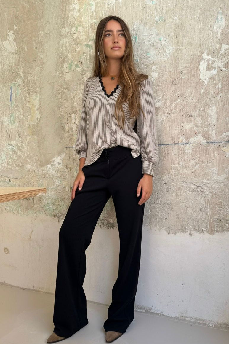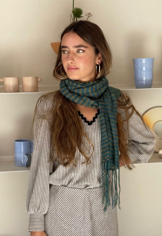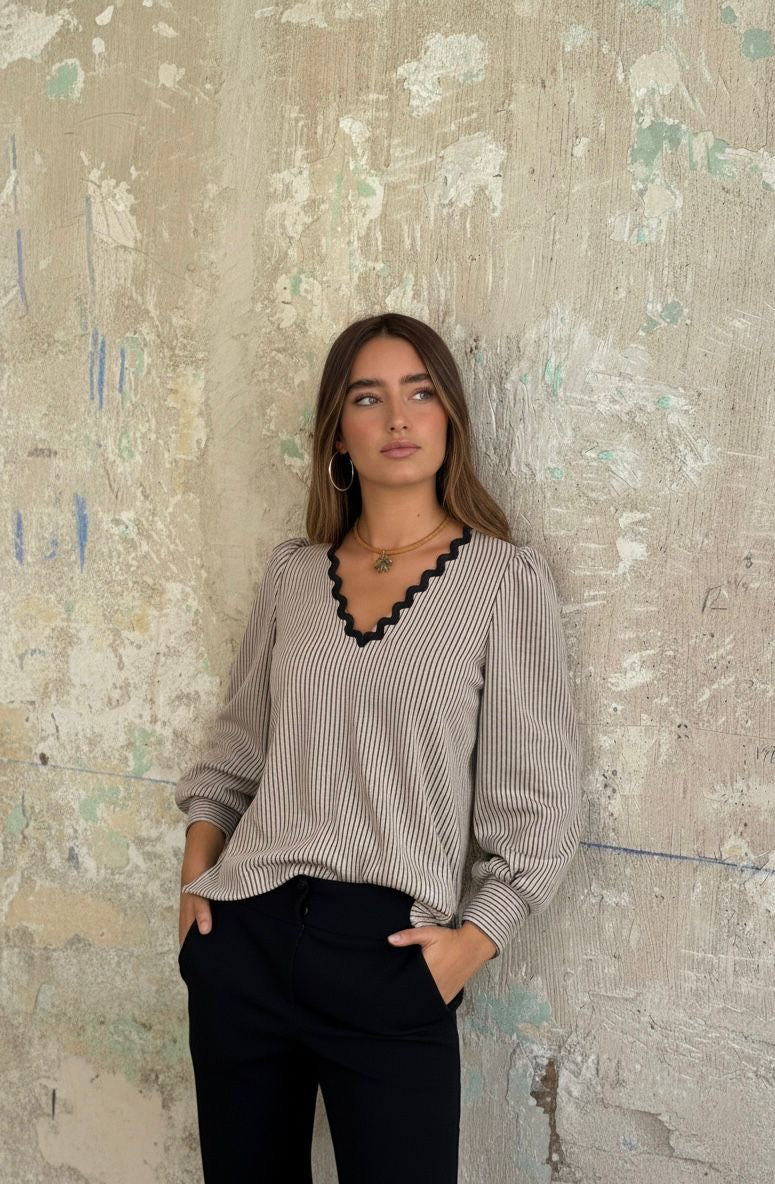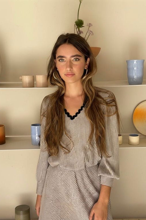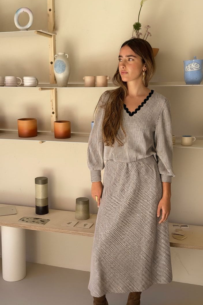 Jersey recto con cuello de pico adornado con unos picos grandes grises. Tiene las mangas fruncidas en el hombro que se rematan con unos puños anchos, de 7 cm, y ajustados. Está realizado en un punto beige con rayas grises antracita. Lo puedes combinar con la falda Edimburgo del mismo tejido disponible en la web. El bajo es recto con dos pequeñas aberturas.