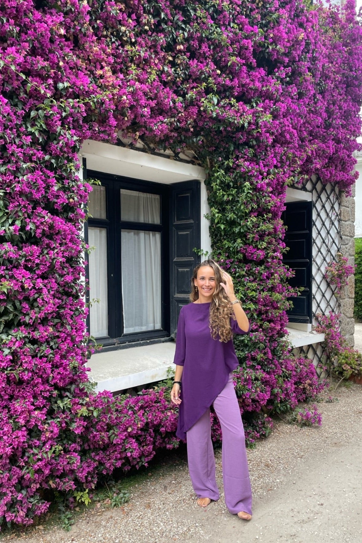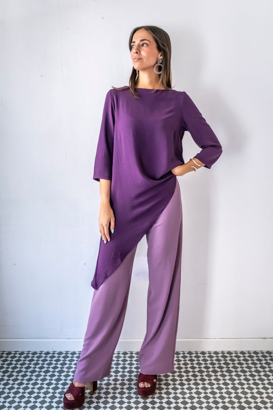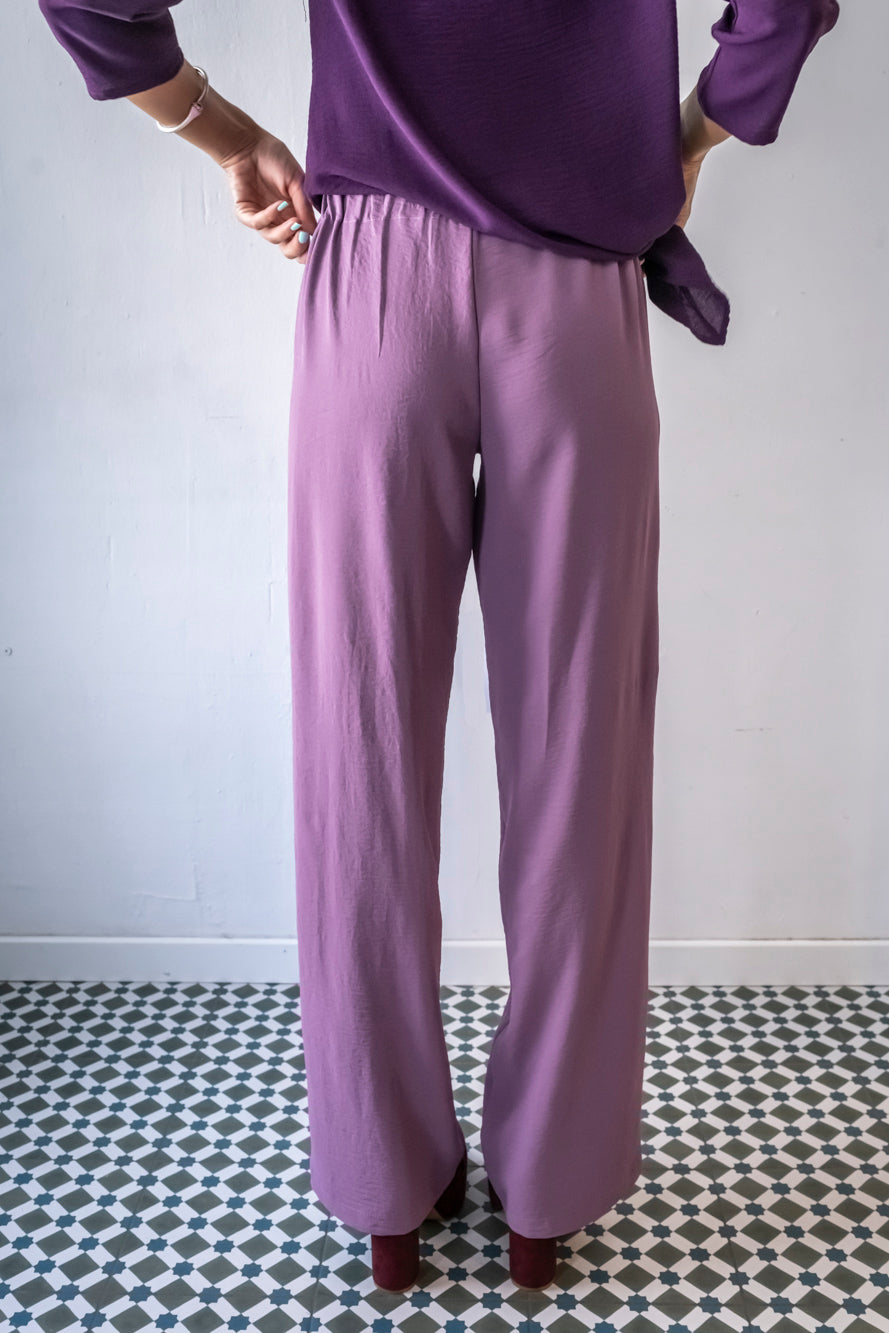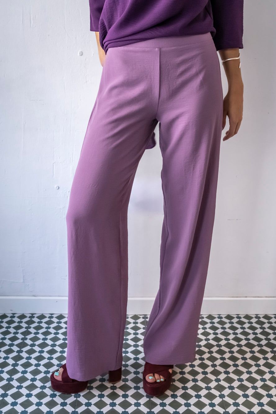 Pantalón palazzo recto, con una cinturilla de 4 cm recta por la parte delantera y con goma por detrás. Está realizado en un tejido fluido malva, sin cremallera y con una bonita caída
