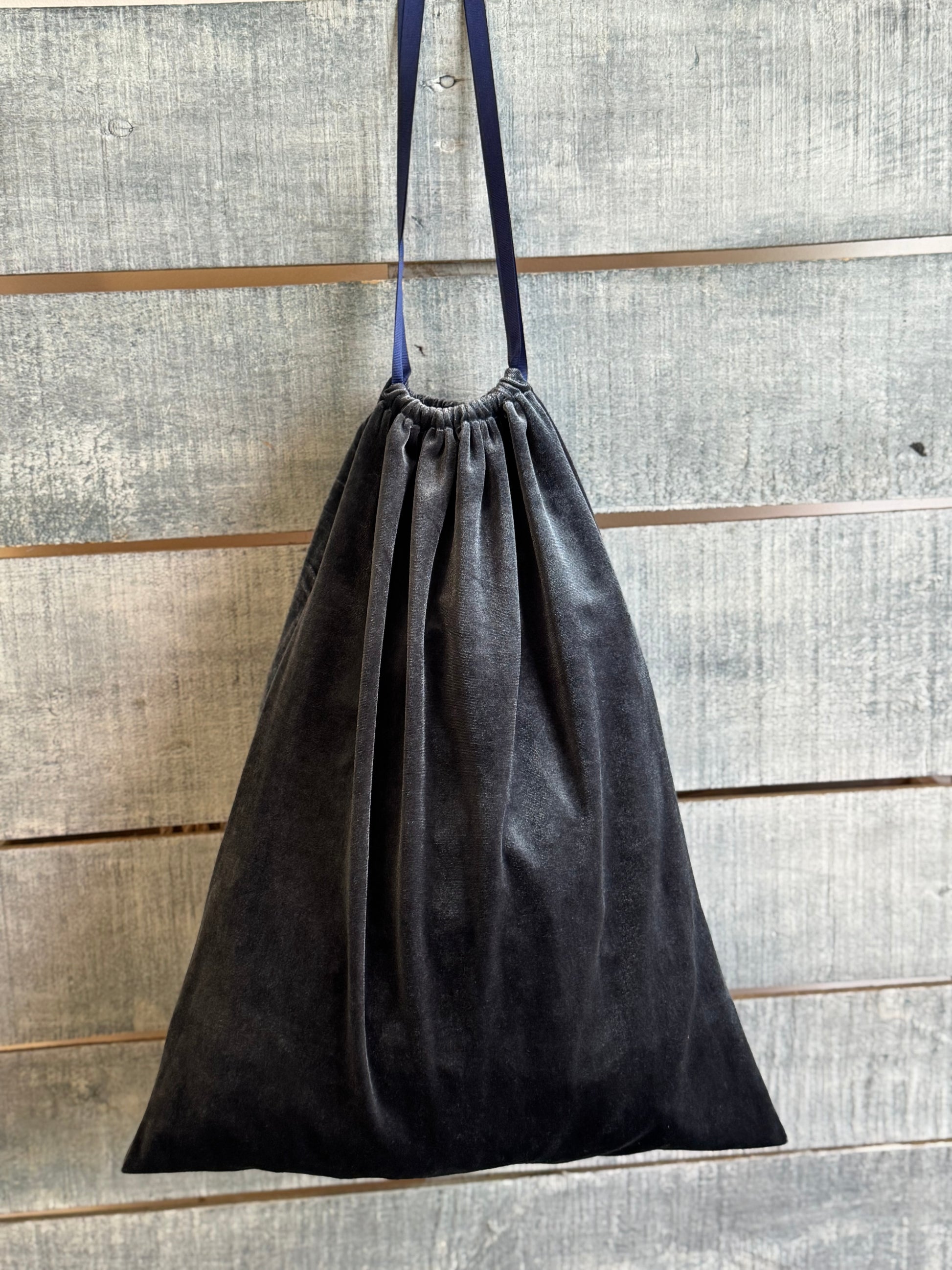 Bolsa con forma de saco de terciopelo en color gris con el cierre de cintas en color azul. Es una bolsa ideal para llevar a bodas o eventos especiales, perfecta para guardar tus zapatos de repuesto, el abanico, chal u otros accesorios de una forma elegante.